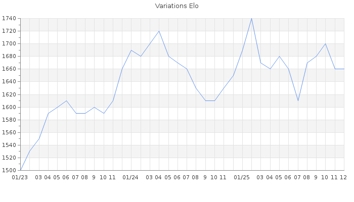 Date d'inscription : 22/06/19. Donateur pour EchecsEmail : Non ( Cliquez ici pour soutenir EchecsEmail. ) Elo non arrondi:1657.1 ( 290 sur 448 joueurs ) Nombre de victoires :479 Nombre de nulles :18 Nombre de défaites :283 Temps de réponse moyen par coup : 0J 2H 14M 45S ( Moyenne sur 232 coups ). Rd ( Un petit rd indique un elo fiable ) : 77 Elo maximum atteint ( en étant classé ) :1740 Elo maximum atteint cette année :1740 Nombre coups joués : 23904 Classement coupe : Inactif Points coupe : 0 Classement Coupe Magic Chess : Inactif Points Coupe Magic Chess : 0 Tournoi échelle : Nombre de tournois gagnés :0