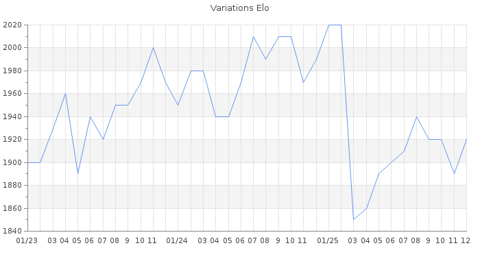 Date d'inscription : 29/10/12. Donateur pour EchecsEmail : Non ( Cliquez ici pour soutenir EchecsEmail. ) Elo non arrondi:1918.5 ( 172 sur 459 joueurs ) Nombre de victoires :1778 Nombre de nulles :471 Nombre de défaites :1643 Temps de réponse moyen par coup : 0J 11H 2M 33S ( Moyenne sur 1122 coups ). Rd ( Un petit rd indique un elo fiable ) : 56 Magic Elo:1280.3 Magic Rd : 258 Elo maximum atteint ( en étant classé ) :2130 Elo maximum atteint cette année :2030 Nombre coups joués : 162605 Inscrit dans l' équipe:Royal Kids Classement coupe : Inactif Points coupe : 0 Classement Coupe Magic Chess : Inactif Points Coupe Magic Chess : 0 Tournoi échelle : Inactif. Tournois gagnés : 22/12/2020 : Cat 4 : Victoire dans le tournoi n°21919 11/12/2020 : Cat 4 : Victoire dans le tournoi n°21881 26/11/2020 : Cat 4 : Victoire dans le tournoi n°21950 03/08/2020 : Cat 4 : Victoire dans le tournoi n°21419 20/06/2020 : Cat 4 : Victoire dans le tournoi n°21282 21/01/2020 : Cat 4 : Victoire dans le tournoi n°20458 19/01/2020 : Cat 4 : Victoire dans le tournoi n°20653 27/11/2019 : Cat 4 : Victoire dans le tournoi n°20202 23/11/2019 : Cat 4 : Victoire dans le tournoi n°20308 13/10/2019 : Cat 4 : Victoire dans le tournoi n°20176 30/09/2019 : Cat 4 : Victoire dans le tournoi n°20095 25/09/2019 : Cat 4 : Victoire dans le tournoi n°20028 03/09/2019 : Cat 4 : Victoire dans le tournoi n°19878 19/08/2019 : Cat 4 : Victoire dans le tournoi n°19851 04/08/2019 : Cat 4 : Victoire dans le tournoi n°19860 06/05/2019 : Cat 4 : Victoire dans le tournoi n°19510 28/04/2019 : Cat 4 : Victoire dans le tournoi n°19325 02/04/2019 : Cat 4 : Victoire dans le tournoi n°19443 01/04/2019 : Cat 4 : Victoire dans le tournoi n°19383 05/02/2019 : Cat 4 : Victoire dans le tournoi n°19226 26/12/2018 : Cat 4 : Victoire dans le tournoi n°18864 04/11/2018 : Cat 4 : Victoire dans le tournoi n°18855 02/10/2018 : Cat 4 : Victoire dans le tournoi n°18601 27/06/2018 : Cat 4 : Victoire dans le tournoi n°18193 10/06/2018 : Cat 4 : Victoire dans le tournoi n°18151 25/05/2018 : Cat 4 : Victoire dans le tournoi n°18016 03/03/2018 : Cat 4 : Victoire dans le tournoi n°17559 25/12/2017 : Cat 4 : Victoire dans le tournoi n°17309 22/03/2017 : Cat 3 : Victoire dans le tournoi n°16172 14/11/2016 : Cat 4 : Victoire dans le tournoi n°15569 31/10/2016 : Cat 4 : Victoire dans le tournoi n°15462 24/10/2016 : Cat 4 : Victoire dans le tournoi n°15517 29/09/2016 : Cat 4 : Victoire dans le tournoi n°14802 20/06/2016 : Cat 4 : Victoire dans le tournoi n°14981 06/05/2016 : Cat 4 : Victoire dans le tournoi n°14719 25/04/2016 : Cat 4 : Victoire dans le tournoi n°14456 04/03/2016 : Cat 4 : Victoire dans le tournoi n°14271 17/02/2016 : Cat 4 : Victoire dans le tournoi n°14090 11/02/2016 : Cat 4 : Victoire dans le tournoi n°18779 06/02/2016 : Cat 4 : Victoire dans le tournoi n°18864 21/01/2016 : Cat 3 : Victoire dans le tournoi n°18980 10/11/2015 : Cat 4 : Victoire dans le tournoi n°18298 21/09/2015 : Cat 4 : Victoire dans le tournoi n°17936 18/09/2015 : Cat 4 : Victoire dans le tournoi n°17883 11/09/2015 : Cat 4 : Victoire dans le tournoi n°18236 04/08/2015 : Cat 4 : Victoire dans le tournoi n°17886 29/05/2015 : Cat 4 : Victoire dans le tournoi n°17664 23/03/2015 : Cat 4 : Victoire dans le tournoi n°17181 05/03/2015 : Cat 4 : Victoire dans le tournoi n°16585 28/02/2015 : Cat 4 : Victoire dans le tournoi n°16934 27/02/2015 : Cat 4 : Victoire dans le tournoi n°16903 24/02/2015 : Cat 4 : Victoire dans le tournoi n°17023 28/12/2014 : Cat 4 : Victoire dans le tournoi n°16308 17/12/2014 : Cat 4 : Victoire dans le tournoi n°16403 15/12/2014 : Cat 4 : Victoire dans le tournoi n°16593 09/12/2014 : Cat 4 : Victoire dans le tournoi n°16155 03/12/2014 : Cat 4 : Victoire dans le tournoi n°16532 11/11/2014 : Cat 3 : Victoire dans le tournoi n°16051 09/11/2014 : Cat 4 : Victoire dans le tournoi n°16338 08/08/2014 : Cat 4 : Victoire dans le tournoi n°15530 06/08/2014 : Cat 4 : Victoire dans le tournoi n°15523 25/07/2014 : Cat 4 : Victoire dans le tournoi n°15524 14/03/2014 : Cat 4 : Victoire dans le tournoi n°14430 22/02/2014 : Cat 4 : Victoire dans le tournoi n°14366 03/02/2014 : Cat 4 : Victoire dans le tournoi n°14197 15/01/2014 : Cat 4 : Victoire dans le tournoi n°14212 27/12/2013 : Cat 4 : Victoire dans le tournoi n°13804 20/11/2013 : Cat 4 : Victoire dans le tournoi n°13649 08/11/2013 : Cat 4 : Victoire dans le tournoi n°13536 02/10/2013 : Cat 4 : Victoire dans le tournoi n°13315 25/09/2013 : Cat 3 : Victoire dans le tournoi n°13362 25/09/2013 : Cat 4 : Victoire dans le tournoi n°13225 26/08/2013 : Cat 4 : Victoire dans le tournoi n°13152 29/06/2013 : Cat 4 : Victoire dans le tournoi n°12541 21/06/2013 : Cat 4 : Victoire dans le tournoi n°12675 17/06/2013 : Cat 4 : Victoire dans le tournoi n°12581 04/06/2013 : Cat 4 : Victoire dans le tournoi n°12622 31/05/2013 : Cat 4 : Victoire dans le tournoi n°12358 11/05/2013 : Cat 3 : Victoire dans le tournoi n°12459 24/04/2013 : Cat 4 : Victoire dans le tournoi n°12051 08/04/2013 : Cat 4 : Victoire dans le tournoi n°12085 02/03/2013 : Cat 4 : Victoire dans le tournoi n°11698 21/11/2012 : Cat 2 : Victoire dans le tournoi n°11094 Nombre de tournois gagnés :83
