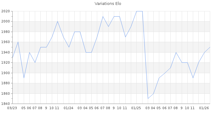 Date d'inscription : 29/10/12. Donateur pour EchecsEmail : Non ( Cliquez ici pour soutenir EchecsEmail. ) Elo non arrondi:1950.8 ( 157 sur 459 joueurs ) Nombre de victoires :1794 Nombre de nulles :473 Nombre de défaites :1648 Temps de réponse moyen par coup : 0J 13H 22M 41S ( Moyenne sur 1202 coups ). Rd ( Un petit rd indique un elo fiable ) : 60 Magic Elo:1280.3 Magic Rd : 258 Elo maximum atteint ( en étant classé ) :2130 Elo maximum atteint cette année :1950 Nombre coups joués : 163433 Inscrit dans l' équipe:Royal Kids Classement coupe : Inactif Points coupe : 0 Classement Coupe Magic Chess : Inactif Points Coupe Magic Chess : 0 Tournoi échelle : Inactif. Tournois gagnés : 22/12/2020 : Cat 4 : Victoire dans le tournoi n°21919 11/12/2020 : Cat 4 : Victoire dans le tournoi n°21881 26/11/2020 : Cat 4 : Victoire dans le tournoi n°21950 03/08/2020 : Cat 4 : Victoire dans le tournoi n°21419 20/06/2020 : Cat 4 : Victoire dans le tournoi n°21282 21/01/2020 : Cat 4 : Victoire dans le tournoi n°20458 19/01/2020 : Cat 4 : Victoire dans le tournoi n°20653 27/11/2019 : Cat 4 : Victoire dans le tournoi n°20202 23/11/2019 : Cat 4 : Victoire dans le tournoi n°20308 13/10/2019 : Cat 4 : Victoire dans le tournoi n°20176 30/09/2019 : Cat 4 : Victoire dans le tournoi n°20095 25/09/2019 : Cat 4 : Victoire dans le tournoi n°20028 03/09/2019 : Cat 4 : Victoire dans le tournoi n°19878 19/08/2019 : Cat 4 : Victoire dans le tournoi n°19851 04/08/2019 : Cat 4 : Victoire dans le tournoi n°19860 06/05/2019 : Cat 4 : Victoire dans le tournoi n°19510 28/04/2019 : Cat 4 : Victoire dans le tournoi n°19325 02/04/2019 : Cat 4 : Victoire dans le tournoi n°19443 01/04/2019 : Cat 4 : Victoire dans le tournoi n°19383 05/02/2019 : Cat 4 : Victoire dans le tournoi n°19226 26/12/2018 : Cat 4 : Victoire dans le tournoi n°18864 04/11/2018 : Cat 4 : Victoire dans le tournoi n°18855 02/10/2018 : Cat 4 : Victoire dans le tournoi n°18601 27/06/2018 : Cat 4 : Victoire dans le tournoi n°18193 10/06/2018 : Cat 4 : Victoire dans le tournoi n°18151 25/05/2018 : Cat 4 : Victoire dans le tournoi n°18016 03/03/2018 : Cat 4 : Victoire dans le tournoi n°17559 25/12/2017 : Cat 4 : Victoire dans le tournoi n°17309 22/03/2017 : Cat 3 : Victoire dans le tournoi n°16172 14/11/2016 : Cat 4 : Victoire dans le tournoi n°15569 31/10/2016 : Cat 4 : Victoire dans le tournoi n°15462 24/10/2016 : Cat 4 : Victoire dans le tournoi n°15517 29/09/2016 : Cat 4 : Victoire dans le tournoi n°14802 20/06/2016 : Cat 4 : Victoire dans le tournoi n°14981 06/05/2016 : Cat 4 : Victoire dans le tournoi n°14719 25/04/2016 : Cat 4 : Victoire dans le tournoi n°14456 04/03/2016 : Cat 4 : Victoire dans le tournoi n°14271 17/02/2016 : Cat 4 : Victoire dans le tournoi n°14090 11/02/2016 : Cat 4 : Victoire dans le tournoi n°18779 06/02/2016 : Cat 4 : Victoire dans le tournoi n°18864 21/01/2016 : Cat 3 : Victoire dans le tournoi n°18980 10/11/2015 : Cat 4 : Victoire dans le tournoi n°18298 21/09/2015 : Cat 4 : Victoire dans le tournoi n°17936 18/09/2015 : Cat 4 : Victoire dans le tournoi n°17883 11/09/2015 : Cat 4 : Victoire dans le tournoi n°18236 04/08/2015 : Cat 4 : Victoire dans le tournoi n°17886 29/05/2015 : Cat 4 : Victoire dans le tournoi n°17664 23/03/2015 : Cat 4 : Victoire dans le tournoi n°17181 05/03/2015 : Cat 4 : Victoire dans le tournoi n°16585 28/02/2015 : Cat 4 : Victoire dans le tournoi n°16934 27/02/2015 : Cat 4 : Victoire dans le tournoi n°16903 24/02/2015 : Cat 4 : Victoire dans le tournoi n°17023 28/12/2014 : Cat 4 : Victoire dans le tournoi n°16308 17/12/2014 : Cat 4 : Victoire dans le tournoi n°16403 15/12/2014 : Cat 4 : Victoire dans le tournoi n°16593 09/12/2014 : Cat 4 : Victoire dans le tournoi n°16155 03/12/2014 : Cat 4 : Victoire dans le tournoi n°16532 11/11/2014 : Cat 3 : Victoire dans le tournoi n°16051 09/11/2014 : Cat 4 : Victoire dans le tournoi n°16338 08/08/2014 : Cat 4 : Victoire dans le tournoi n°15530 06/08/2014 : Cat 4 : Victoire dans le tournoi n°15523 25/07/2014 : Cat 4 : Victoire dans le tournoi n°15524 14/03/2014 : Cat 4 : Victoire dans le tournoi n°14430 22/02/2014 : Cat 4 : Victoire dans le tournoi n°14366 03/02/2014 : Cat 4 : Victoire dans le tournoi n°14197 15/01/2014 : Cat 4 : Victoire dans le tournoi n°14212 27/12/2013 : Cat 4 : Victoire dans le tournoi n°13804 20/11/2013 : Cat 4 : Victoire dans le tournoi n°13649 08/11/2013 : Cat 4 : Victoire dans le tournoi n°13536 02/10/2013 : Cat 4 : Victoire dans le tournoi n°13315 25/09/2013 : Cat 3 : Victoire dans le tournoi n°13362 25/09/2013 : Cat 4 : Victoire dans le tournoi n°13225 26/08/2013 : Cat 4 : Victoire dans le tournoi n°13152 29/06/2013 : Cat 4 : Victoire dans le tournoi n°12541 21/06/2013 : Cat 4 : Victoire dans le tournoi n°12675 17/06/2013 : Cat 4 : Victoire dans le tournoi n°12581 04/06/2013 : Cat 4 : Victoire dans le tournoi n°12622 31/05/2013 : Cat 4 : Victoire dans le tournoi n°12358 11/05/2013 : Cat 3 : Victoire dans le tournoi n°12459 24/04/2013 : Cat 4 : Victoire dans le tournoi n°12051 08/04/2013 : Cat 4 : Victoire dans le tournoi n°12085 02/03/2013 : Cat 4 : Victoire dans le tournoi n°11698 21/11/2012 : Cat 2 : Victoire dans le tournoi n°11094 Nombre de tournois gagnés :83