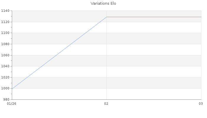 Date d'inscription : 10/01/26. Donateur pour EchecsEmail : Non ( Cliquez ici pour soutenir EchecsEmail. ) Elo non arrondi:1125.1 ( 437 sur 445 joueurs ) Nombre de victoires :1 Nombre de nulles :0 Nombre de défaites :6 Temps de réponse moyen par coup : 0J 6H 18M 29S ( Moyenne sur 62 coups ). Rd ( Un petit rd indique un elo fiable ) : 182 Elo maximum atteint ( en étant classé ) :0 Elo maximum atteint cette année :0 Nombre coups joués : 176 Classement coupe : Inactif Points coupe : 0 Classement Coupe Magic Chess : Inactif Points Coupe Magic Chess : 0 Tournoi échelle : Nombre de tournois gagnés :0