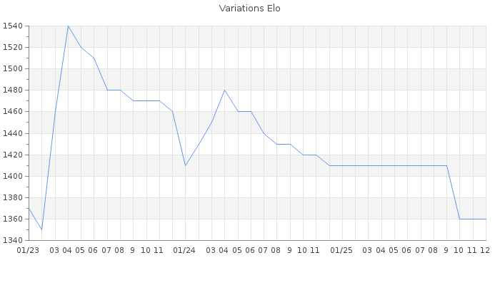 Date d'inscription : 22/12/18. Donateur pour EchecsEmail : Non ( Cliquez ici pour soutenir EchecsEmail. ) Elo non arrondi:1364.1 ( 410 sur 448 joueurs ) Nombre de victoires :22 Nombre de nulles :13 Nombre de défaites :117 Temps de réponse moyen par coup : 0J 2H 15M 13S ( Moyenne sur 115 coups ). Rd ( Un petit rd indique un elo fiable ) : 126 Elo maximum atteint ( en étant classé ) :1540 Elo maximum atteint cette année :1410 Nombre coups joués : 6004 Classement coupe : Inactif Points coupe : 0 Classement Coupe Magic Chess : Inactif Points Coupe Magic Chess : 0 Tournoi échelle : Nombre de tournois gagnés :0