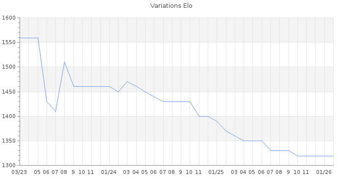 Date d'inscription : 20/12/17. Donateur pour EchecsEmail : Oui ( Cliquez ici pour soutenir EchecsEmail. ) Elo non arrondi:1313.8 ( 428 sur 459 joueurs ) Nombre de victoires :13 Nombre de nulles :2 Nombre de défaites :71 Temps de réponse moyen par coup : 0J 19H 20M 18S ( Moyenne sur 29 coups ). Rd ( Un petit rd indique un elo fiable ) : 164 Elo maximum atteint ( en étant classé ) :1650 Elo maximum atteint cette année :0 Nombre coups joués : 6897 Classement coupe : Inactif Points coupe : 0 Classement Coupe Magic Chess : Inactif Points Coupe Magic Chess : 0 Tournoi échelle : Inactif. Nombre de tournois gagnés :0