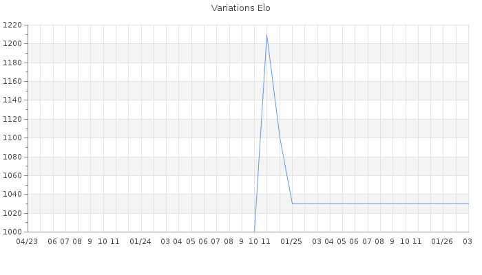 Date d'inscription : 18/04/15. Donateur pour EchecsEmail : Non ( Cliquez ici pour soutenir EchecsEmail. ) Elo non arrondi:995.6 ( 495 sur 445 joueurs ) Nombre de victoires :138 Nombre de nulles :5 Nombre de défaites :307 Temps de réponse moyen par coup : 0J 13H 50M 23S ( Moyenne sur 1 coups ). Rd ( Un petit rd indique un elo fiable ) : 50 Magic Elo:1397.5 Magic Rd : 230 Elo maximum atteint ( en étant classé ) :1560 Elo maximum atteint cette année :0 Nombre coups joués : 10246 Classement coupe : Inactif Points coupe : 0 Classement Coupe Magic Chess : Inactif Points Coupe Magic Chess : 0 Tournoi échelle : Inactif. Tournois gagnés : 26/01/2025 : Cat 0 : Victoire dans le tournoi n°26172 05/05/2016 : Cat 1 : Victoire dans le tournoi n°14596 17/03/2016 : Cat 1 : Victoire dans le tournoi n°14316 03/03/2016 : Cat 1 : Victoire dans le tournoi n°14389 02/03/2016 : Cat 1 : Victoire dans le tournoi n°14393 18/02/2016 : Cat 1 : Victoire dans le tournoi n°14292 Nombre de tournois gagnés :6