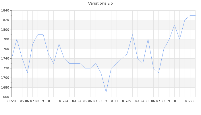 Date d'inscription : 02/09/06. Donateur pour EchecsEmail : Non ( Cliquez ici pour soutenir EchecsEmail. ) Elo non arrondi:1832.1 ( 218 sur 459 joueurs ) Nombre de victoires :1305 Nombre de nulles :163 Nombre de défaites :806 Temps de réponse moyen par coup : 0J 5H 21M 37S ( Moyenne sur 669 coups ). Rd ( Un petit rd indique un elo fiable ) : 66 Magic Elo:1600 Magic Rd : 350 Elo maximum atteint ( en étant classé ) :1970 Elo maximum atteint cette année :1840 Nombre coups joués : 76783 Classement coupe : Inactif Points coupe : 0 Classement Coupe Magic Chess : Inactif Points Coupe Magic Chess : 0 Tournoi échelle : Tournois gagnés : 28/05/2007 : Cat 1 : Victoire dans le tournoi n°4018 23/02/2007 : Cat 0 : Victoire dans le tournoi n°3551 12/01/2007 : Cat 0 : Victoire dans le tournoi n°3630 21/08/2006 : Cat 0 : Victoire dans le tournoi n°3242 18/07/2006 : Cat 0 : Victoire dans le tournoi n°2912 03/06/2006 : Cat 0 : Victoire dans le tournoi n°2982 25/03/2006 : Cat 0 : Victoire dans le tournoi n°2571 19/03/2006 : Cat 0 : Victoire dans le tournoi n°2549 08/03/2006 : Cat 0 : Victoire dans le tournoi n°2504 18/01/2006 : Cat 0 : Victoire dans le tournoi n°2348 21/11/2005 : Cat 0 : Victoire dans le tournoi n°2197 05/11/2005 : Cat 0 : Victoire dans le tournoi n°2132 Nombre de tournois gagnés :12