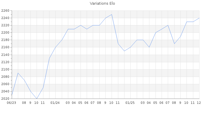 Date d'inscription : 04/06/23. Donateur pour EchecsEmail : Non ( Cliquez ici pour soutenir EchecsEmail. ) Elo non arrondi:2238.6 ( 53 sur 454 joueurs ) Nombre de victoires :65 Nombre de nulles :19 Nombre de défaites :26 Temps de réponse moyen par coup : 0J 16H 4M 10S ( Moyenne sur 122 coups ). Rd ( Un petit rd indique un elo fiable ) : 96 Magic Elo:1700 Magic Rd : 350 Elo maximum atteint ( en étant classé ) :2280 Elo maximum atteint cette année :2250 Nombre coups joués : 2914 Classement coupe : Inactif Points coupe : 0 Classement Coupe Magic Chess : Inactif Points Coupe Magic Chess : 0 Tournoi échelle : Inactif. Tournois gagnés : 08/10/2024 : Cat 5 : Victoire dans le tournoi n°25948 08/06/2024 : Cat 5 : Victoire dans le tournoi n°25826 12/03/2024 : Cat 5 : Victoire dans le tournoi n°25626 27/01/2024 : Cat 5 : Victoire dans le tournoi n°25520 20/12/2023 : Cat 4 : Victoire dans le tournoi n°25339 14/10/2023 : Cat 4 : Victoire dans le tournoi n°25224 13/09/2023 : Cat 4 : Victoire dans le tournoi n°25168 31/07/2023 : Cat 4 : Victoire dans le tournoi n°25044 28/06/2023 : Cat 3 : Victoire dans le tournoi n°25016 22/06/2023 : Cat 2 : Victoire dans le tournoi n°24975 Nombre de tournois gagnés :10
