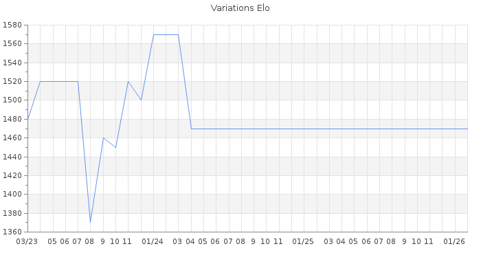 Date d'inscription : 08/08/06. Donateur pour EchecsEmail : Oui ( Cliquez ici pour soutenir EchecsEmail. ) Elo non arrondi:1436 ( 438 sur 458 joueurs ) Nombre de victoires :146 Nombre de nulles :17 Nombre de défaites :134 Temps de réponse moyen par coup : 0J 16H 32M 53S ( Moyenne sur 0 coups ). Rd ( Un petit rd indique un elo fiable ) : 72 Magic Elo:1700 Magic Rd : 350 Elo maximum atteint ( en étant classé ) :1700 Elo maximum atteint cette année :0 Nombre coups joués : 8573 Classement coupe : Inactif Points coupe : 0 Classement Coupe Magic Chess : Inactif Points Coupe Magic Chess : 0 Tournoi échelle : Inactif. Tournois gagnés : 16/02/2020 : Cat 2 : Victoire dans le tournoi n°20700 12/07/2005 : Cat 0 : Victoire dans le tournoi n°1386 Nombre de tournois gagnés :2