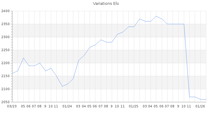 Date d'inscription : 21/03/21. Donateur pour EchecsEmail : Non ( Cliquez ici pour soutenir EchecsEmail. ) Elo non arrondi:2062.3 ( 109 sur 463 joueurs ) Nombre de victoires :392 Nombre de nulles :62 Nombre de défaites :186 Temps de réponse moyen par coup : 0J 2H 52M 20S ( Moyenne sur 254 coups ). Rd ( Un petit rd indique un elo fiable ) : 80 Elo maximum atteint ( en étant classé ) :2380 Elo maximum atteint cette année :2070 Nombre coups joués : 21526 Inscrit dans l' équipe:Fair play Classement coupe : 34 Points coupe : 1211.09 Classement Coupe Magic Chess : Inactif Points Coupe Magic Chess : 0 Tournoi échelle : Inactif. Tournois gagnés : 22/04/2024 : Cat 4 : Victoire CC Avr24 Asc 08/04/2024 : Cat 4 : Victoire CC Mar24 08/10/2023 : Cat 5 : Victoire dans le tournoi n°25254 15/10/2022 : Cat 5 : Victoire dans le tournoi n°24285 22/10/2021 : Cat 4 : Victoire dans le tournoi n°23228 10/07/2021 : Cat 4 : Victoire dans le tournoi n°22704 31/05/2021 : Cat 0 : Victoire dans le tournoi n°22589 16/05/2021 : Cat 4 : Victoire dans le tournoi n°22696 24/04/2021 : Cat 2 : Victoire dans le tournoi n°22618 22/04/2021 : Cat 4 : Victoire dans le tournoi n°22664 21/04/2021 : Cat 3 : Victoire dans le tournoi n°22683 16/04/2021 : Cat 3 : Victoire dans le tournoi n°22614 14/04/2021 : Cat 3 : Victoire dans le tournoi n°22641 13/04/2021 : Cat 3 : Victoire dans le tournoi n°22630 27/03/2021 : Cat 1 : Victoire dans le tournoi n°22578 Nombre de tournois gagnés :15