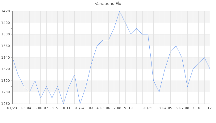 Date d'inscription : 05/10/13. Donateur pour EchecsEmail : Non ( Cliquez ici pour soutenir EchecsEmail. ) Elo non arrondi:1324.5 ( 421 sur 448 joueurs ) Nombre de victoires :319 Nombre de nulles :18 Nombre de défaites :489 Temps de réponse moyen par coup : 0J 5H 31M 16S ( Moyenne sur 695 coups ). Rd ( Un petit rd indique un elo fiable ) : 68 Magic Elo:1700 Magic Rd : 350 Elo maximum atteint ( en étant classé ) :1420 Elo maximum atteint cette année :1400 Nombre coups joués : 29734 Inscrit dans l' équipe:Sol Seppy Classement coupe : Inactif Points coupe : 0 Classement Coupe Magic Chess : Inactif Points Coupe Magic Chess : 0 Tournoi échelle : Inactif. Tournois gagnés : 12/05/2025 : Cat 0 : Victoire dans le tournoi n°26618 27/11/2019 : Cat 0 : Victoire dans le tournoi n°20119 Nombre de tournois gagnés :2