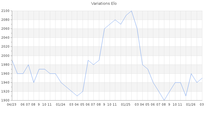 Date d'inscription : 04/02/11. Donateur pour EchecsEmail : Non ( Cliquez ici pour soutenir EchecsEmail. ) Elo non arrondi:1946.3 ( 151 sur 439 joueurs ) Nombre de victoires :1730 Nombre de nulles :229 Nombre de défaites :728 Temps de réponse moyen par coup : 0J 10H 45M 56S ( Moyenne sur 400 coups ). Rd ( Un petit rd indique un elo fiable ) : 75 Magic Elo:1425.73 Magic Rd : 80 Elo maximum atteint ( en étant classé ) :2160 Elo maximum atteint cette année :1970 Nombre coups joués : 94312 Inscrit dans l' équipe:au plaisir du jeux Classement coupe : Inactif Points coupe : 0 Classement Coupe Magic Chess : Inactif Points Coupe Magic Chess : 0 Tournoi échelle : Inactif. Tournois gagnés : 07/09/2021 : Cat 3 : Victoire dans le tournoi n°23066 05/04/2021 : Cat 4 : Victoire dans le tournoi n°22539 19/10/2020 : Cat 3 : Victoire dans le tournoi n°21655 23/08/2020 : Cat 3 : Victoire dans le tournoi n°21660 10/08/2020 : Cat 3 : Victoire dans le tournoi n°21629 08/08/2020 : Cat 3 : Victoire dans le tournoi n°21599 29/06/2020 : Cat 3 : Victoire dans le tournoi n°21418 07/06/2020 : Cat 3 : Victoire dans le tournoi n°21194 05/06/2020 : Cat 3 : Victoire dans le tournoi n°21218 15/04/2020 : Cat 3 : Victoire dans le tournoi n°21093 03/06/2019 : Cat 4 : Victoire dans le tournoi n°19519 23/04/2019 : Cat 3 : Victoire dans le tournoi n°19549 28/03/2019 : Cat 3 : Victoire dans le tournoi n°19367 12/03/2019 : Cat 3 : Victoire dans le tournoi n°19400 24/04/2017 : Cat 3 : Victoire dans le tournoi n°16488 12/04/2017 : Cat 3 : Victoire dans le tournoi n°16373 19/04/2016 : Cat 4 : Victoire dans le tournoi n°14669 25/03/2015 : Cat 3 : Victoire dans le tournoi n°17126 12/02/2015 : Cat 3 : Victoire dans le tournoi n°17081 20/06/2014 : Cat 4 : Victoire dans le tournoi n°15404 03/03/2014 : Cat 5 : Victoire dans le tournoi n°14650 07/09/2013 : Cat 4 : Victoire dans le tournoi n°13211 30/08/2013 : Cat 4 : Victoire dans le tournoi n°13166 14/08/2013 : Cat 4 : Victoire dans le tournoi n°13101 19/09/2012 : Cat 4 : Victoire dans le tournoi n°10756 20/06/2012 : Cat 3 : Victoire dans le tournoi n°10475 09/08/2011 : Cat 3 : Victoire dans le tournoi n°8969 Nombre de tournois gagnés :27