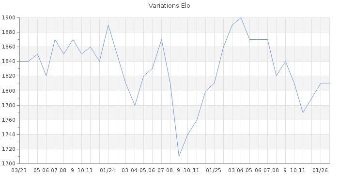 Date d'inscription : 20/04/08. Donateur pour EchecsEmail : Non ( Cliquez ici pour soutenir EchecsEmail. ) Elo non arrondi:1806.4 ( 230 sur 459 joueurs ) Nombre de victoires :755 Nombre de nulles :71 Nombre de défaites :1119 Temps de réponse moyen par coup : 0J 3H 23M 10S ( Moyenne sur 963 coups ). Rd ( Un petit rd indique un elo fiable ) : 67 Magic Elo:1600 Magic Rd : 350 Elo maximum atteint ( en étant classé ) :1940 Elo maximum atteint cette année :1810 Nombre coups joués : 62932 Inscrit dans l' équipe:Avalon Classement coupe : Inactif, date de la dernière qualification : 04/02/24 Points coupe : 24.19 Classement Coupe Magic Chess : Inactif Points Coupe Magic Chess : 0 Tournoi échelle : Inactif. Tournois gagnés : 07/12/2021 : Cat 3 : Premier au tournoi multi Automne 2021 n°1 16/11/2021 : Cat 2 : Premier au tournoi multi Automne 2021 n°4 15/04/2021 : Cat 2 : Premier au tournoi multi Printemps 2021 n°4 09/04/2021 : Cat 2 : Premier au tournoi multi Saint-Valentin 2021 n°1 11/03/2021 : Cat 2 : Premier au tournoi multi Saint-Valentin 2021 n°2 08/03/2019 : Cat 2 : Victoire dans le tournoi n°19374 23/09/2017 : Cat 2 : Victoire dans le tournoi n°16865 03/02/2017 : Cat 3 : Victoire dans le tournoi n°16043 21/08/2016 : Cat 2 : Victoire dans le tournoi n°15017 13/06/2016 : Cat 2 : Victoire dans le tournoi n°14902 30/12/2015 : Cat 3 : Victoire dans le tournoi n°18917 01/12/2015 : Cat 2 : Victoire dans le tournoi n°18736 21/01/2015 : Cat 2 : Victoire dans le tournoi n°16611 17/07/2013 : Cat 3 : Victoire dans le tournoi n°12692 14/10/2012 : Cat 4 : Victoire dans le tournoi n°10685 06/12/2011 : Cat 4 : Victoire dans le tournoi n°9467 27/09/2011 : Cat 4 : Victoire dans le tournoi n°9040 18/08/2011 : Cat 4 : Victoire dans le tournoi n°8866 05/07/2010 : Cat 3 : Victoire dans le tournoi n°7416 13/04/2010 : Cat 3 : Victoire dans le tournoi n°7059 17/02/2010 : Cat 3 : Victoire dans le tournoi n°6794 03/12/2009 : Cat 2 : Victoire dans le tournoi n°6604 17/06/2009 : Cat 3 : Victoire dans le tournoi n°5787 17/06/2009 : Cat 3 : Victoire dans le tournoi n°5757 17/06/2009 : Cat 2 : Victoire dans le tournoi n°5553 16/01/2009 : Cat 2 : Victoire dans le tournoi n°5553 05/11/2008 : Cat 1 : Victoire dans le tournoi n°4966 05/11/2008 : Cat 0 : Victoire dans le tournoi n°4945 Nombre de tournois gagnés :33