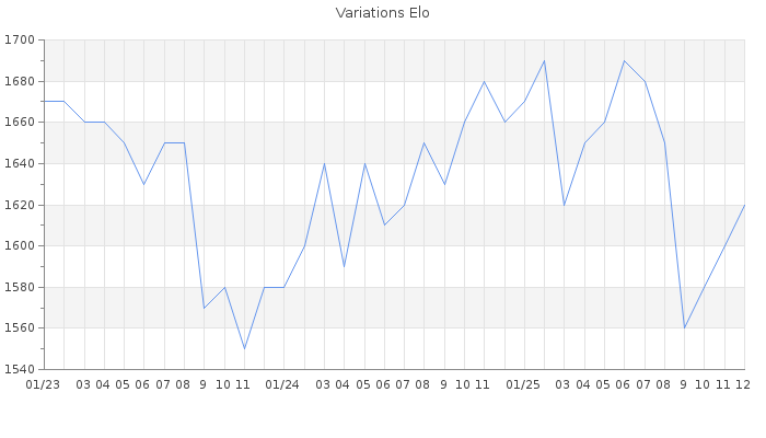 Date d'inscription : 20/02/11. Donateur pour EchecsEmail : Non ( Cliquez ici pour soutenir EchecsEmail. ) Elo non arrondi:1620.7 ( 313 sur 448 joueurs ) Nombre de victoires :562 Nombre de nulles :55 Nombre de défaites :452 Temps de réponse moyen par coup : 0J 11H 58M 49S ( Moyenne sur 406 coups ). Rd ( Un petit rd indique un elo fiable ) : 73 Elo maximum atteint ( en étant classé ) :1890 Elo maximum atteint cette année :1700 Nombre coups joués : 37621 Classement coupe : Inactif Points coupe : 0 Classement Coupe Magic Chess : Inactif Points Coupe Magic Chess : 0 Tournoi échelle : Nombre de tournois gagnés :0