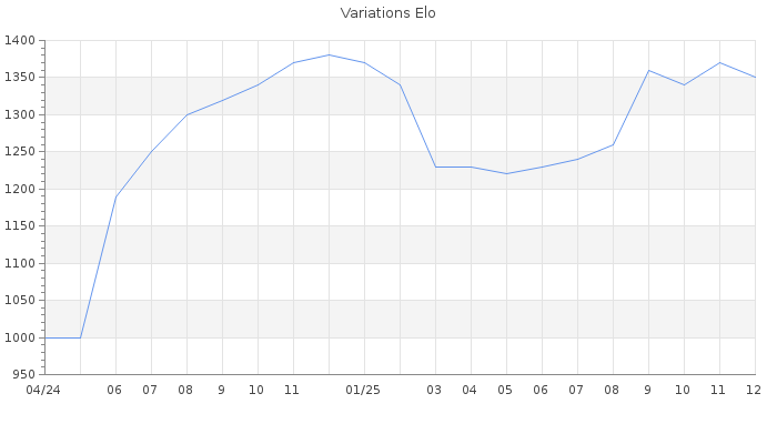 Date d'inscription : 20/04/24. Donateur pour EchecsEmail : Non ( Cliquez ici pour soutenir EchecsEmail. ) Elo non arrondi:1354.6 ( 412 sur 449 joueurs ) Nombre de victoires :104 Nombre de nulles :1 Nombre de défaites :172 Temps de réponse moyen par coup : 0J 12H 43M 28S ( Moyenne sur 949 coups ). Rd ( Un petit rd indique un elo fiable ) : 66 Elo maximum atteint ( en étant classé ) :1430 Elo maximum atteint cette année :1410 Nombre coups joués : 8433 Classement coupe : Inactif Points coupe : 0 Classement Coupe Magic Chess : Inactif Points Coupe Magic Chess : 0 Tournoi échelle : Nombre de tournois gagnés :0