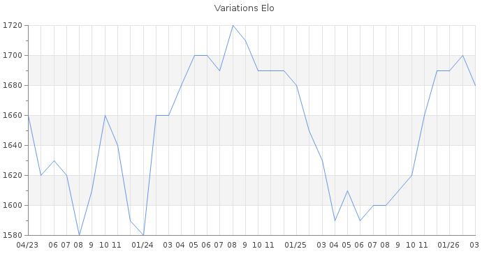 Date d'inscription : 15/04/08. Donateur pour EchecsEmail : Non ( Cliquez ici pour soutenir EchecsEmail. ) Elo non arrondi:1679 ( 271 sur 438 joueurs ) Nombre de victoires :1768 Nombre de nulles :197 Nombre de défaites :1593 Temps de réponse moyen par coup : 0J 20H 47M 49S ( Moyenne sur 348 coups ). Rd ( Un petit rd indique un elo fiable ) : 72 Magic Elo:1355.45 Magic Rd : 212 Elo maximum atteint ( en étant classé ) :1870 Elo maximum atteint cette année :1710 Nombre coups joués : 127311 Inscrit dans l' équipe:La Diagonale du Fou Classement coupe : Inactif Points coupe : 0 Classement Coupe Magic Chess : Inactif Points Coupe Magic Chess : 0 Tournoi échelle : Inactif. Tournois gagnés : 03/06/2024 : Cat 2 : Premier au tournoi multi Saint-Valentin 2024 n°1 21/04/2024 : Cat 2 : Premier au tournoi multi Saint-Valentin 2024 n°4 23/03/2022 : Cat 2 : Premier au tournoi multi Saint-Valentin 2022 n°2 17/03/2022 : Cat 1 : Premier au tournoi multi Noël 2021 n°3 16/11/2021 : Cat 1 : Premier au tournoi multi Halloween 2021 n°3 06/03/2021 : Cat 2 : Premier au tournoi multi Saint-Valentin 2021 n°4 11/12/2020 : Cat 2 : Premier au tournoi multi Halloween 2020 n°2 13/08/2020 : Cat 2 : Victoire dans le tournoi n°21458 30/09/2018 : Cat 2 : Victoire dans le tournoi n°18188 02/09/2018 : Cat 2 : Victoire dans le tournoi n°18144 09/05/2018 : Cat 0 : Premier au tournoi multi Noël 2017 n°1 24/01/2018 : Cat 0 : Premier au tournoi multi Noël 2017 n°2 13/12/2017 : Cat 0 : Premier au tournoi multi Automne 2017 n°1 02/12/2017 : Cat 2 : Victoire dans le tournoi n°17235 27/11/2017 : Cat 2 : Victoire dans le tournoi n°16983 26/10/2017 : Cat 0 : Premier au tournoi multi Automne 2017 n°3 02/07/2017 : Cat 2 : Premier au tournoi multi Printemps 2017 n°5 08/04/2017 : Cat 2 : Victoire dans le tournoi n°16110 28/01/2017 : Cat 2 : Victoire dans le tournoi n°15695 22/01/2017 : Cat 0 : Premier au tournoi multi Halloween 2016 n°4 11/01/2017 : Cat 1 : Victoire dans le tournoi n°15125 04/03/2016 : Cat 2 : Victoire dans le tournoi n°14309 11/01/2016 : Cat 2 : Victoire dans le tournoi n°18999 25/11/2015 : Cat 2 : Victoire dans le tournoi n°18418 05/10/2015 : Cat 2 : Victoire dans le tournoi n°18337 18/03/2014 : Cat 1 : Victoire dans le tournoi n°14327 30/06/2013 : Cat 2 : Victoire dans le tournoi n°12247 24/04/2013 : Cat 2 : Victoire dans le tournoi n°12080 09/02/2012 : Cat 2 : Victoire dans le tournoi n°9687 04/12/2011 : Cat 2 : Victoire dans le tournoi n°9294 21/11/2011 : Cat 2 : Victoire dans le tournoi n°9275 14/11/2011 : Cat 2 : Victoire dans le tournoi n°9399 08/11/2011 : Cat 3 : Victoire dans le tournoi n°9068 21/09/2011 : Cat 2 : Victoire dans le tournoi n°8846 15/07/2011 : Cat 3 : Victoire dans le tournoi n°8835 27/06/2011 : Cat 2 : Victoire dans le tournoi n°8642 09/06/2011 : Cat 2 : Victoire dans le tournoi n°8614 02/06/2011 : Cat 2 : Victoire dans le tournoi n°8627 14/04/2011 : Cat 2 : Victoire dans le tournoi n°8496 Nombre de tournois gagnés :46