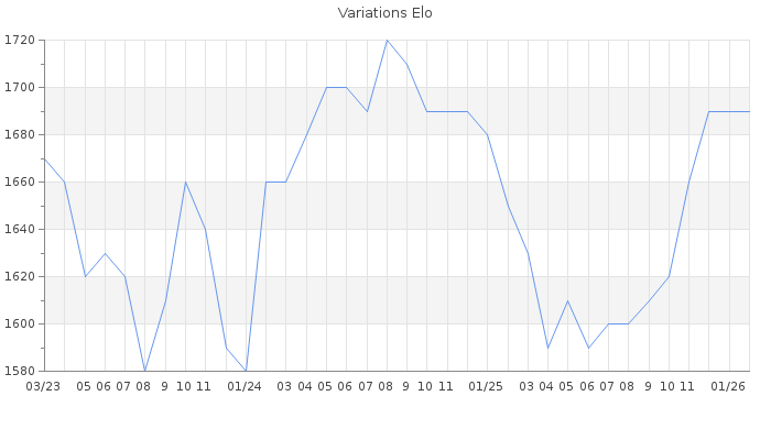 Date d'inscription : 15/04/08. Donateur pour EchecsEmail : Non ( Cliquez ici pour soutenir EchecsEmail. ) Elo non arrondi:1693.2 ( 288 sur 463 joueurs ) Nombre de victoires :1765 Nombre de nulles :197 Nombre de défaites :1589 Temps de réponse moyen par coup : 0J 19H 24M 29S ( Moyenne sur 425 coups ). Rd ( Un petit rd indique un elo fiable ) : 66 Magic Elo:1355.45 Magic Rd : 212 Elo maximum atteint ( en étant classé ) :1870 Elo maximum atteint cette année :1710 Nombre coups joués : 127144 Inscrit dans l' équipe:La Diagonale du Fou Classement coupe : Inactif Points coupe : 0 Classement Coupe Magic Chess : Inactif Points Coupe Magic Chess : 0 Tournoi échelle : Inactif. Tournois gagnés : 03/06/2024 : Cat 2 : Premier au tournoi multi Saint-Valentin 2024 n°1 21/04/2024 : Cat 2 : Premier au tournoi multi Saint-Valentin 2024 n°4 23/03/2022 : Cat 2 : Premier au tournoi multi Saint-Valentin 2022 n°2 17/03/2022 : Cat 1 : Premier au tournoi multi Noël 2021 n°3 16/11/2021 : Cat 1 : Premier au tournoi multi Halloween 2021 n°3 06/03/2021 : Cat 2 : Premier au tournoi multi Saint-Valentin 2021 n°4 11/12/2020 : Cat 2 : Premier au tournoi multi Halloween 2020 n°2 13/08/2020 : Cat 2 : Victoire dans le tournoi n°21458 30/09/2018 : Cat 2 : Victoire dans le tournoi n°18188 02/09/2018 : Cat 2 : Victoire dans le tournoi n°18144 09/05/2018 : Cat 0 : Premier au tournoi multi Noël 2017 n°1 24/01/2018 : Cat 0 : Premier au tournoi multi Noël 2017 n°2 13/12/2017 : Cat 0 : Premier au tournoi multi Automne 2017 n°1 02/12/2017 : Cat 2 : Victoire dans le tournoi n°17235 27/11/2017 : Cat 2 : Victoire dans le tournoi n°16983 26/10/2017 : Cat 0 : Premier au tournoi multi Automne 2017 n°3 02/07/2017 : Cat 2 : Premier au tournoi multi Printemps 2017 n°5 08/04/2017 : Cat 2 : Victoire dans le tournoi n°16110 28/01/2017 : Cat 2 : Victoire dans le tournoi n°15695 22/01/2017 : Cat 0 : Premier au tournoi multi Halloween 2016 n°4 11/01/2017 : Cat 1 : Victoire dans le tournoi n°15125 04/03/2016 : Cat 2 : Victoire dans le tournoi n°14309 11/01/2016 : Cat 2 : Victoire dans le tournoi n°18999 25/11/2015 : Cat 2 : Victoire dans le tournoi n°18418 05/10/2015 : Cat 2 : Victoire dans le tournoi n°18337 18/03/2014 : Cat 1 : Victoire dans le tournoi n°14327 30/06/2013 : Cat 2 : Victoire dans le tournoi n°12247 24/04/2013 : Cat 2 : Victoire dans le tournoi n°12080 09/02/2012 : Cat 2 : Victoire dans le tournoi n°9687 04/12/2011 : Cat 2 : Victoire dans le tournoi n°9294 21/11/2011 : Cat 2 : Victoire dans le tournoi n°9275 14/11/2011 : Cat 2 : Victoire dans le tournoi n°9399 08/11/2011 : Cat 3 : Victoire dans le tournoi n°9068 21/09/2011 : Cat 2 : Victoire dans le tournoi n°8846 15/07/2011 : Cat 3 : Victoire dans le tournoi n°8835 27/06/2011 : Cat 2 : Victoire dans le tournoi n°8642 09/06/2011 : Cat 2 : Victoire dans le tournoi n°8614 02/06/2011 : Cat 2 : Victoire dans le tournoi n°8627 14/04/2011 : Cat 2 : Victoire dans le tournoi n°8496 Nombre de tournois gagnés :46