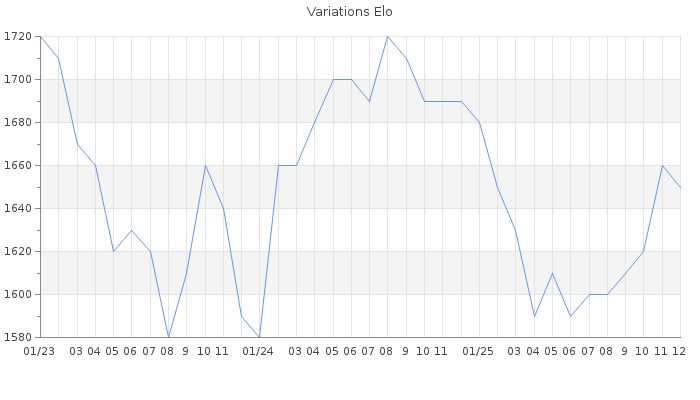 Date d'inscription : 15/04/08. Donateur pour EchecsEmail : Non ( Cliquez ici pour soutenir EchecsEmail. ) Elo non arrondi:1645.5 ( 305 sur 448 joueurs ) Nombre de victoires :1758 Nombre de nulles :197 Nombre de défaites :1586 Temps de réponse moyen par coup : 0J 19H 49M 48S ( Moyenne sur 460 coups ). Rd ( Un petit rd indique un elo fiable ) : 72 Magic Elo:1355.45 Magic Rd : 212 Elo maximum atteint ( en étant classé ) :1870 Elo maximum atteint cette année :1700 Nombre coups joués : 126802 Inscrit dans l' équipe:La Diagonale du Fou Classement coupe : Inactif Points coupe : 0 Classement Coupe Magic Chess : Inactif Points Coupe Magic Chess : 0 Tournoi échelle : Inactif. Tournois gagnés : 03/06/2024 : Cat 2 : Premier au tournoi multi Saint-Valentin 2024 n°1 21/04/2024 : Cat 2 : Premier au tournoi multi Saint-Valentin 2024 n°4 23/03/2022 : Cat 2 : Premier au tournoi multi Saint-Valentin 2022 n°2 17/03/2022 : Cat 1 : Premier au tournoi multi Noël 2021 n°3 16/11/2021 : Cat 1 : Premier au tournoi multi Halloween 2021 n°3 06/03/2021 : Cat 2 : Premier au tournoi multi Saint-Valentin 2021 n°4 11/12/2020 : Cat 2 : Premier au tournoi multi Halloween 2020 n°2 13/08/2020 : Cat 2 : Victoire dans le tournoi n°21458 30/09/2018 : Cat 2 : Victoire dans le tournoi n°18188 02/09/2018 : Cat 2 : Victoire dans le tournoi n°18144 09/05/2018 : Cat 0 : Premier au tournoi multi Noël 2017 n°1 24/01/2018 : Cat 0 : Premier au tournoi multi Noël 2017 n°2 13/12/2017 : Cat 0 : Premier au tournoi multi Automne 2017 n°1 02/12/2017 : Cat 2 : Victoire dans le tournoi n°17235 27/11/2017 : Cat 2 : Victoire dans le tournoi n°16983 26/10/2017 : Cat 0 : Premier au tournoi multi Automne 2017 n°3 02/07/2017 : Cat 2 : Premier au tournoi multi Printemps 2017 n°5 08/04/2017 : Cat 2 : Victoire dans le tournoi n°16110 28/01/2017 : Cat 2 : Victoire dans le tournoi n°15695 22/01/2017 : Cat 0 : Premier au tournoi multi Halloween 2016 n°4 11/01/2017 : Cat 1 : Victoire dans le tournoi n°15125 04/03/2016 : Cat 2 : Victoire dans le tournoi n°14309 11/01/2016 : Cat 2 : Victoire dans le tournoi n°18999 25/11/2015 : Cat 2 : Victoire dans le tournoi n°18418 05/10/2015 : Cat 2 : Victoire dans le tournoi n°18337 18/03/2014 : Cat 1 : Victoire dans le tournoi n°14327 30/06/2013 : Cat 2 : Victoire dans le tournoi n°12247 24/04/2013 : Cat 2 : Victoire dans le tournoi n°12080 09/02/2012 : Cat 2 : Victoire dans le tournoi n°9687 04/12/2011 : Cat 2 : Victoire dans le tournoi n°9294 21/11/2011 : Cat 2 : Victoire dans le tournoi n°9275 14/11/2011 : Cat 2 : Victoire dans le tournoi n°9399 08/11/2011 : Cat 3 : Victoire dans le tournoi n°9068 21/09/2011 : Cat 2 : Victoire dans le tournoi n°8846 15/07/2011 : Cat 3 : Victoire dans le tournoi n°8835 27/06/2011 : Cat 2 : Victoire dans le tournoi n°8642 09/06/2011 : Cat 2 : Victoire dans le tournoi n°8614 02/06/2011 : Cat 2 : Victoire dans le tournoi n°8627 14/04/2011 : Cat 2 : Victoire dans le tournoi n°8496 Nombre de tournois gagnés :46