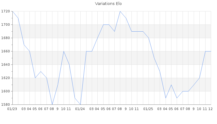 Date d'inscription : 15/04/08. Donateur pour EchecsEmail : Non ( Cliquez ici pour soutenir EchecsEmail. ) Elo non arrondi:1662.2 ( 305 sur 458 joueurs ) Nombre de victoires :1759 Nombre de nulles :197 Nombre de défaites :1586 Temps de réponse moyen par coup : 0J 19H 34M 57S ( Moyenne sur 485 coups ). Rd ( Un petit rd indique un elo fiable ) : 70 Magic Elo:1355.45 Magic Rd : 212 Elo maximum atteint ( en étant classé ) :1870 Elo maximum atteint cette année :1700 Nombre coups joués : 126877 Inscrit dans l' équipe:La Diagonale du Fou Classement coupe : Inactif Points coupe : 0 Classement Coupe Magic Chess : Inactif Points Coupe Magic Chess : 0 Tournoi échelle : Inactif. Tournois gagnés : 03/06/2024 : Cat 2 : Premier au tournoi multi Saint-Valentin 2024 n°1 21/04/2024 : Cat 2 : Premier au tournoi multi Saint-Valentin 2024 n°4 23/03/2022 : Cat 2 : Premier au tournoi multi Saint-Valentin 2022 n°2 17/03/2022 : Cat 1 : Premier au tournoi multi Noël 2021 n°3 16/11/2021 : Cat 1 : Premier au tournoi multi Halloween 2021 n°3 06/03/2021 : Cat 2 : Premier au tournoi multi Saint-Valentin 2021 n°4 11/12/2020 : Cat 2 : Premier au tournoi multi Halloween 2020 n°2 13/08/2020 : Cat 2 : Victoire dans le tournoi n°21458 30/09/2018 : Cat 2 : Victoire dans le tournoi n°18188 02/09/2018 : Cat 2 : Victoire dans le tournoi n°18144 09/05/2018 : Cat 0 : Premier au tournoi multi Noël 2017 n°1 24/01/2018 : Cat 0 : Premier au tournoi multi Noël 2017 n°2 13/12/2017 : Cat 0 : Premier au tournoi multi Automne 2017 n°1 02/12/2017 : Cat 2 : Victoire dans le tournoi n°17235 27/11/2017 : Cat 2 : Victoire dans le tournoi n°16983 26/10/2017 : Cat 0 : Premier au tournoi multi Automne 2017 n°3 02/07/2017 : Cat 2 : Premier au tournoi multi Printemps 2017 n°5 08/04/2017 : Cat 2 : Victoire dans le tournoi n°16110 28/01/2017 : Cat 2 : Victoire dans le tournoi n°15695 22/01/2017 : Cat 0 : Premier au tournoi multi Halloween 2016 n°4 11/01/2017 : Cat 1 : Victoire dans le tournoi n°15125 04/03/2016 : Cat 2 : Victoire dans le tournoi n°14309 11/01/2016 : Cat 2 : Victoire dans le tournoi n°18999 25/11/2015 : Cat 2 : Victoire dans le tournoi n°18418 05/10/2015 : Cat 2 : Victoire dans le tournoi n°18337 18/03/2014 : Cat 1 : Victoire dans le tournoi n°14327 30/06/2013 : Cat 2 : Victoire dans le tournoi n°12247 24/04/2013 : Cat 2 : Victoire dans le tournoi n°12080 09/02/2012 : Cat 2 : Victoire dans le tournoi n°9687 04/12/2011 : Cat 2 : Victoire dans le tournoi n°9294 21/11/2011 : Cat 2 : Victoire dans le tournoi n°9275 14/11/2011 : Cat 2 : Victoire dans le tournoi n°9399 08/11/2011 : Cat 3 : Victoire dans le tournoi n°9068 21/09/2011 : Cat 2 : Victoire dans le tournoi n°8846 15/07/2011 : Cat 3 : Victoire dans le tournoi n°8835 27/06/2011 : Cat 2 : Victoire dans le tournoi n°8642 09/06/2011 : Cat 2 : Victoire dans le tournoi n°8614 02/06/2011 : Cat 2 : Victoire dans le tournoi n°8627 14/04/2011 : Cat 2 : Victoire dans le tournoi n°8496 Nombre de tournois gagnés :46