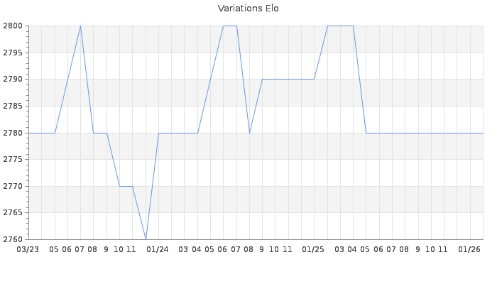 Date d'inscription : 18/10/13. Donateur pour EchecsEmail : Non ( Cliquez ici pour soutenir EchecsEmail. ) Elo non arrondi:2762.8 ( 7 sur 459 joueurs ) Nombre de victoires :66 Nombre de nulles :40 Nombre de défaites :7 Temps de réponse moyen par coup : 1J 1H 58M 3S ( Moyenne sur 33 coups ). Rd ( Un petit rd indique un elo fiable ) : 115 Elo maximum atteint ( en étant classé ) :2800 Elo maximum atteint cette année :0 Nombre coups joués : 3685 Inscrit dans l' équipe:Les Rois du Succes Classement coupe : 29 Points coupe : 1656.73 Classement Coupe Magic Chess : Inactif Points Coupe Magic Chess : 0 Tournoi échelle : Inactif. Nombre de tournois gagnés :1