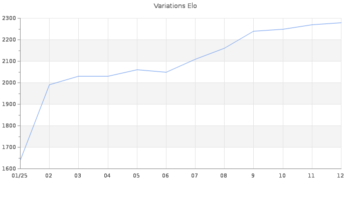 Date d'inscription : 17/01/25. Donateur pour EchecsEmail : Non ( Cliquez ici pour soutenir EchecsEmail. ) Elo non arrondi:2277.8 ( 43 sur 449 joueurs ) Nombre de victoires :81 Nombre de nulles :17 Nombre de défaites :28 Temps de réponse moyen par coup : 0J 8H 8M 27S ( Moyenne sur 807 coups ). Rd ( Un petit rd indique un elo fiable ) : 65 Elo maximum atteint ( en étant classé ) :2280 Elo maximum atteint cette année :2280 Nombre coups joués : 3833 Inscrit dans l' équipe:La Diagonale du Fou Classement coupe : 30 Points coupe : 1512.8 Classement Coupe Magic Chess : Inactif Points Coupe Magic Chess : 0 Tournoi échelle : Nombre de tournois gagnés :0