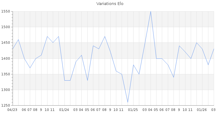 Date d'inscription : 21/03/20. Donateur pour EchecsEmail : Non ( Cliquez ici pour soutenir EchecsEmail. ) Elo non arrondi:1422.9 ( 382 sur 445 joueurs ) Nombre de victoires :1556 Nombre de nulles :103 Nombre de défaites :3026 Temps de réponse moyen par coup : 0J 6H 48M 45S ( Moyenne sur 4733 coups ). Rd ( Un petit rd indique un elo fiable ) : 50 Magic Elo:1230.57 Magic Rd : 211 Elo maximum atteint ( en étant classé ) :1660 Elo maximum atteint cette année :1550 Nombre coups joués : 110878 Inscrit dans l' équipe:Avalon Classement coupe : 117 Points coupe : 29.36 Classement Coupe Magic Chess : Inactif Points Coupe Magic Chess : 0 Tournoi échelle : Inactif. Tournois gagnés : 10/04/2023 : Cat 2 : Victoire dans le tournoi n°24785 09/03/2022 : Cat 1 : Victoire dans le tournoi n°23706 17/05/2021 : Cat 3 : Victoire dans le tournoi n°22781 01/05/2021 : Cat 3 : Victoire dans le tournoi n°22656 18/04/2021 : Cat 3 : Victoire dans le tournoi n°22649 03/04/2021 : Cat 2 : Victoire dans le tournoi n°22575 31/03/2021 : Cat 1 : Victoire dans le tournoi n°22594 27/03/2021 : Cat 1 : Victoire dans le tournoi n°22534 20/03/2021 : Cat 2 : Victoire dans le tournoi n°22472 15/03/2021 : Cat 1 : Victoire dans le tournoi n°22473 20/02/2021 : Cat 2 : Victoire dans le tournoi n°22450 14/02/2021 : Cat 2 : Victoire dans le tournoi n°22377 06/02/2021 : Cat 2 : Victoire dans le tournoi n°22387 30/01/2021 : Cat 2 : Victoire dans le tournoi n°22345 07/07/2020 : Cat 1 : Victoire dans le tournoi n°21420 06/04/2020 : Cat 1 : Victoire dans le tournoi n°20984 Nombre de tournois gagnés :16