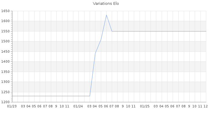 Date d'inscription : 13/10/21. Donateur pour EchecsEmail : Non ( Cliquez ici pour soutenir EchecsEmail. ) Elo non arrondi:1521.4 ( 372 sur 448 joueurs ) Nombre de victoires :14 Nombre de nulles :0 Nombre de défaites :13 Temps de réponse moyen par coup : 0J 15H 44M 25S ( Moyenne sur 0 coups ). Rd ( Un petit rd indique un elo fiable ) : 89 Elo maximum atteint ( en étant classé ) :1630 Elo maximum atteint cette année :0 Nombre coups joués : 500 Classement coupe : Inactif Points coupe : 0 Classement Coupe Magic Chess : Inactif Points Coupe Magic Chess : 0 Tournoi échelle : Tournois gagnés : 27/06/2024 : Cat 1 : Victoire dans le tournoi n°25765 27/06/2024 : Cat 1 : Victoire dans le tournoi n°25818 Nombre de tournois gagnés :2