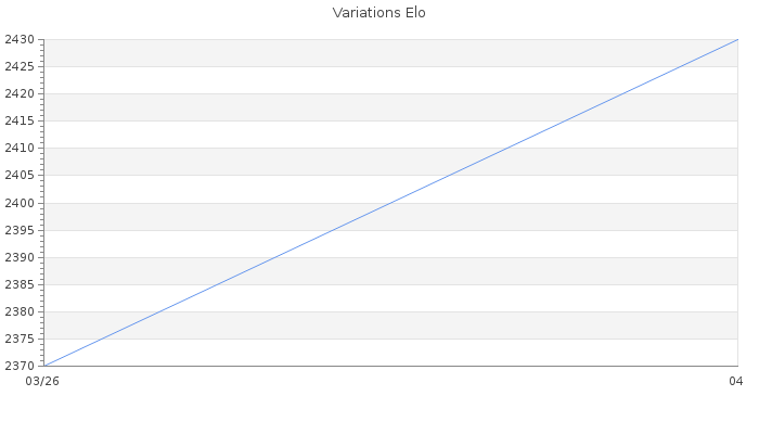 Date d'inscription : 12/03/26. Donateur pour EchecsEmail : Non ( Cliquez ici pour soutenir EchecsEmail. ) Elo non arrondi:2433.6 ( 33 sur 453 joueurs ) Nombre de victoires :27 Nombre de nulles :0 Nombre de défaites :0 Temps de réponse moyen par coup : 0J 3H 23M 41S ( Moyenne sur 477 coups ). Rd ( Un petit rd indique un elo fiable ) : 106 Magic Elo:1700 Magic Rd : 350 Elo maximum atteint ( en étant classé ) :2430 Elo maximum atteint cette année :2430 Nombre coups joués : 739 Classement coupe : 73 Points coupe : 222.4 Classement Coupe Magic Chess : Inactif Points Coupe Magic Chess : 0 Tournoi échelle : Inactif. Tournois gagnés : 13/04/2026 : Cat 4 : Premier au tournoi multi Printemps 2026 n°3 02/04/2026 : Cat 4 : Victoire dans le tournoi n°27536 31/03/2026 : Cat 3 : Victoire dans le tournoi n°27527 30/03/2026 : Cat 4 : Victoire dans le tournoi n°27542 Nombre de tournois gagnés :5