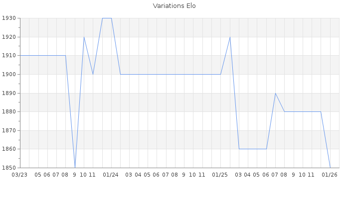 Date d'inscription : Avant le 20/12/05. Donateur pour EchecsEmail : Non ( Cliquez ici pour soutenir EchecsEmail. ) Elo non arrondi:1853.2 ( 211 sur 463 joueurs ) Nombre de victoires :467 Nombre de nulles :187 Nombre de défaites :431 Temps de réponse moyen par coup : 0J 16H 59M 3S ( Moyenne sur 42 coups ). Rd ( Un petit rd indique un elo fiable ) : 120 Magic Elo:1360.9 Magic Rd : 164 Elo maximum atteint ( en étant classé ) :1970 Elo maximum atteint cette année :1850 Nombre coups joués : 35015 Classement coupe : 132 Points coupe : 16.11 Classement Coupe Magic Chess : Inactif Points Coupe Magic Chess : 0 Tournoi échelle : Inactif. Tournois gagnés : 13/10/2021 : Cat 3 : Victoire dans le tournoi n°23167 05/03/2019 : Cat 3 : Victoire dans le tournoi n°19281 22/10/2012 : Cat 3 : Victoire dans le tournoi n°10627 05/08/2011 : Cat 3 : Victoire dans le tournoi n°8481 29/04/2011 : Cat 3 : Victoire dans le tournoi n°8555 09/01/2011 : Cat 3 : Victoire dans le tournoi n°8135 31/08/2008 : Cat 0 : Premier au tournoi multi Eté 2008 n°3 14/05/2008 : Cat 3 : Victoire dans le tournoi n°4845 26/01/2008 : Cat 0 : Premier au tournoi multi Noel 2007 n°3 25/11/2007 : Cat 0 : Premier au tournoi multi Automne 2007 n°6 31/10/2007 : Cat 2 : Victoire dans le tournoi n°4404 18/04/2007 : Cat 1 : Victoire dans le tournoi n°3792 18/02/2007 : Cat 1 : Victoire dans le tournoi n°3782 25/11/2005 : Cat 0 : Victoire dans le tournoi n°2139 27/06/2005 : Cat 0 : Victoire dans le tournoi n°1684 Nombre de tournois gagnés :15