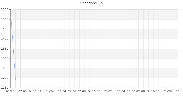Date d'inscription : 08/05/23. Donateur pour EchecsEmail : Non ( Cliquez ici pour soutenir EchecsEmail. ) Elo non arrondi:1149.4 ( 506 sur 448 joueurs ) Nombre de victoires :1 Nombre de nulles :0 Nombre de défaites :2 Rd ( Un petit rd indique un elo fiable ) : 205 Elo maximum atteint ( en étant classé ) :0 Elo maximum atteint cette année :0 Nombre coups joués : 90 Classement coupe : Inactif Points coupe : 0 Classement Coupe Magic Chess : Inactif Points Coupe Magic Chess : 0 Tournoi échelle : Nombre de tournois gagnés :0