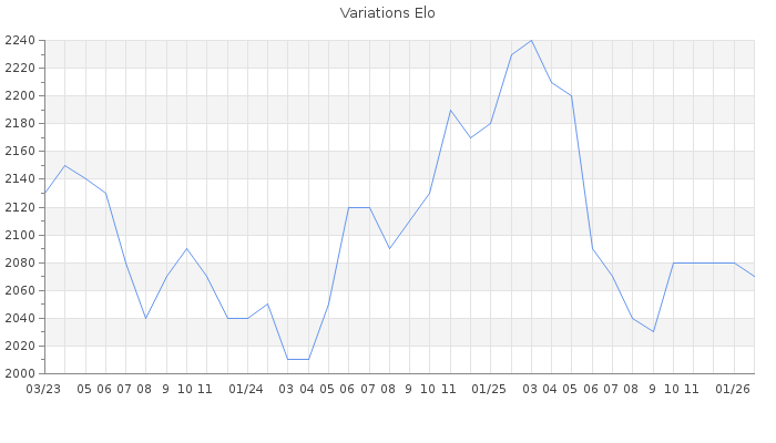 Date d'inscription : 11/02/10. Donateur pour EchecsEmail : Non ( Cliquez ici pour soutenir EchecsEmail. ) Elo non arrondi:2074.1 ( 101 sur 454 joueurs ) Nombre de victoires :987 Nombre de nulles :165 Nombre de défaites :693 Temps de réponse moyen par coup : 0J 18H 10M 14S ( Moyenne sur 201 coups ). Rd ( Un petit rd indique un elo fiable ) : 91 Magic Elo:1600 Magic Rd : 350 Elo maximum atteint ( en étant classé ) :2250 Elo maximum atteint cette année :2100 Nombre coups joués : 66504 Inscrit dans l' équipe:Vikings Classement coupe : Inactif, date de la dernière qualification : 11/07/22 Points coupe : 9.11 Classement Coupe Magic Chess : Inactif Points Coupe Magic Chess : 0 Tournoi échelle : Inactif. Tournois gagnés : 10/05/2019 : Cat 4 : Victoire dans le tournoi n°19622 16/06/2017 : Cat 3 : Victoire dans le tournoi n°16634 16/02/2017 : Cat 3 : Victoire dans le tournoi n°16097 22/12/2016 : Cat 3 : Victoire dans le tournoi n°15656 17/10/2016 : Cat 3 : Victoire dans le tournoi n°15384 24/07/2016 : Cat 3 : Victoire dans le tournoi n°15020 19/07/2016 : Cat 3 : Victoire dans le tournoi n°14909 14/07/2016 : Cat 3 : Victoire dans le tournoi n°15103 28/02/2016 : Cat 4 : Victoire dans le tournoi n°18658 25/01/2016 : Cat 4 : Victoire dans le tournoi n°14263 23/01/2016 : Cat 3 : Victoire dans le tournoi n°18847 05/01/2016 : Cat 4 : Victoire dans le tournoi n°18936 02/01/2016 : Cat 4 : Victoire dans le tournoi n°14101 21/12/2015 : Cat 4 : Victoire dans le tournoi n°18901 09/09/2015 : Cat 4 : Victoire dans le tournoi n°18358 01/09/2015 : Cat 3 : Victoire dans le tournoi n°18328 23/06/2015 : Cat 3 : Victoire dans le tournoi n°17916 24/03/2015 : Cat 0 : Premier au tournoi multi Saint-Valentin 2015 n°5 04/03/2015 : Cat 2 : Victoire dans le tournoi n°17171 04/01/2015 : Cat 0 : Premier au tournoi multi Noël 2014 n°7 19/12/2014 : Cat 2 : Victoire dans le tournoi n°16620 07/11/2014 : Cat 2 : Victoire dans le tournoi n°16336 20/07/2014 : Cat 3 : Victoire dans le tournoi n°15463 16/12/2013 : Cat 3 : Victoire dans le tournoi n°13954 16/12/2013 : Cat 2 : Victoire dans le tournoi n°13916 17/11/2013 : Cat 1 : Victoire dans le tournoi n°13714 17/11/2013 : Cat 1 : Victoire dans le tournoi n°13524 13/11/2013 : Cat 1 : Victoire dans le tournoi n°13670 04/11/2013 : Cat 1 : Victoire dans le tournoi n°13510 18/03/2011 : Cat 3 : Victoire dans le tournoi n°8152 27/07/2010 : Cat 2 : Victoire dans le tournoi n°7330 19/04/2010 : Cat 2 : Victoire dans le tournoi n°7250 Nombre de tournois gagnés :32