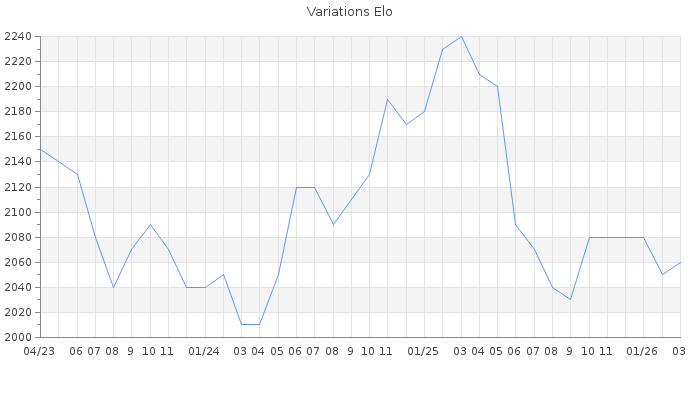 Date d'inscription : 11/02/10. Donateur pour EchecsEmail : Non ( Cliquez ici pour soutenir EchecsEmail. ) Elo non arrondi:2060.2 ( 103 sur 445 joueurs ) Nombre de victoires :990 Nombre de nulles :168 Nombre de défaites :693 Temps de réponse moyen par coup : 0J 22H 5M 9S ( Moyenne sur 189 coups ). Rd ( Un petit rd indique un elo fiable ) : 87 Magic Elo:1600 Magic Rd : 350 Elo maximum atteint ( en étant classé ) :2250 Elo maximum atteint cette année :2100 Nombre coups joués : 66621 Inscrit dans l' équipe:Vikings Classement coupe : Inactif, date de la dernière qualification : 11/07/22 Points coupe : 8.66 Classement Coupe Magic Chess : Inactif Points Coupe Magic Chess : 0 Tournoi échelle : Inactif. Tournois gagnés : 10/05/2019 : Cat 4 : Victoire dans le tournoi n°19622 16/06/2017 : Cat 3 : Victoire dans le tournoi n°16634 16/02/2017 : Cat 3 : Victoire dans le tournoi n°16097 22/12/2016 : Cat 3 : Victoire dans le tournoi n°15656 17/10/2016 : Cat 3 : Victoire dans le tournoi n°15384 24/07/2016 : Cat 3 : Victoire dans le tournoi n°15020 19/07/2016 : Cat 3 : Victoire dans le tournoi n°14909 14/07/2016 : Cat 3 : Victoire dans le tournoi n°15103 28/02/2016 : Cat 4 : Victoire dans le tournoi n°18658 25/01/2016 : Cat 4 : Victoire dans le tournoi n°14263 23/01/2016 : Cat 3 : Victoire dans le tournoi n°18847 05/01/2016 : Cat 4 : Victoire dans le tournoi n°18936 02/01/2016 : Cat 4 : Victoire dans le tournoi n°14101 21/12/2015 : Cat 4 : Victoire dans le tournoi n°18901 09/09/2015 : Cat 4 : Victoire dans le tournoi n°18358 01/09/2015 : Cat 3 : Victoire dans le tournoi n°18328 23/06/2015 : Cat 3 : Victoire dans le tournoi n°17916 24/03/2015 : Cat 0 : Premier au tournoi multi Saint-Valentin 2015 n°5 04/03/2015 : Cat 2 : Victoire dans le tournoi n°17171 04/01/2015 : Cat 0 : Premier au tournoi multi Noël 2014 n°7 19/12/2014 : Cat 2 : Victoire dans le tournoi n°16620 07/11/2014 : Cat 2 : Victoire dans le tournoi n°16336 20/07/2014 : Cat 3 : Victoire dans le tournoi n°15463 16/12/2013 : Cat 3 : Victoire dans le tournoi n°13954 16/12/2013 : Cat 2 : Victoire dans le tournoi n°13916 17/11/2013 : Cat 1 : Victoire dans le tournoi n°13714 17/11/2013 : Cat 1 : Victoire dans le tournoi n°13524 13/11/2013 : Cat 1 : Victoire dans le tournoi n°13670 04/11/2013 : Cat 1 : Victoire dans le tournoi n°13510 18/03/2011 : Cat 3 : Victoire dans le tournoi n°8152 27/07/2010 : Cat 2 : Victoire dans le tournoi n°7330 19/04/2010 : Cat 2 : Victoire dans le tournoi n°7250 Nombre de tournois gagnés :32