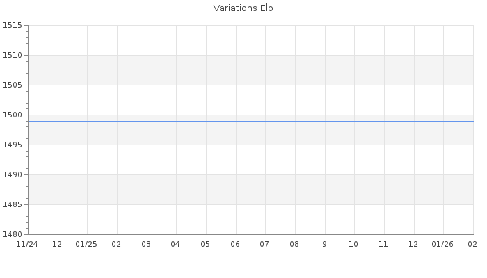Date d'inscription : 11/11/24. Donateur pour EchecsEmail : Non ( Cliquez ici pour soutenir EchecsEmail. ) Elo non arrondi:1469 ( 0 sur 451 joueurs ) Nombre de victoires :0 Nombre de nulles :0 Nombre de défaites :0 Rd ( Un petit rd indique un elo fiable ) : 350 Elo maximum atteint ( en étant classé ) :0 Elo maximum atteint cette année :0 Nombre coups joués : 0 Classement coupe : Inactif Points coupe : 0 Classement Coupe Magic Chess : Inactif Points Coupe Magic Chess : 0 Tournoi échelle : Nombre de tournois gagnés :0