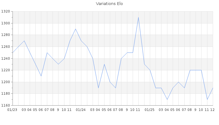 Date d'inscription : 14/09/15. Donateur pour EchecsEmail : Non ( Cliquez ici pour soutenir EchecsEmail. ) Elo non arrondi:1187 ( 435 sur 448 joueurs ) Nombre de victoires :287 Nombre de nulles :10 Nombre de défaites :517 Temps de réponse moyen par coup : 0J 9H 30M 40S ( Moyenne sur 580 coups ). Rd ( Un petit rd indique un elo fiable ) : 70 Magic Elo:1600 Magic Rd : 350 Elo maximum atteint ( en étant classé ) :1400 Elo maximum atteint cette année :1260 Nombre coups joués : 32629 Classement coupe : Inactif Points coupe : 0 Classement Coupe Magic Chess : Inactif Points Coupe Magic Chess : 0 Tournoi échelle : Inactif. Nombre de tournois gagnés :0