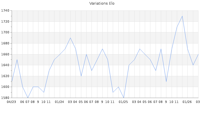 Date d'inscription : 16/10/22. Donateur pour EchecsEmail : Non ( Cliquez ici pour soutenir EchecsEmail. ) Elo non arrondi:1656.7 ( 284 sur 441 joueurs ) Nombre de victoires :647 Nombre de nulles :67 Nombre de défaites :828 Temps de réponse moyen par coup : 0J 4H 1M 30S ( Moyenne sur 3366 coups ). Rd ( Un petit rd indique un elo fiable ) : 50 Magic Elo:1809.84 Magic Rd : 80 Elo maximum atteint ( en étant classé ) :1780 Elo maximum atteint cette année :1730 Nombre coups joués : 67523 Inscrit dans l' équipe:Royal Kids Classement coupe : 57 Points coupe : 395.73 Classement Coupe Magic Chess : 5 Points Coupe Magic Chess : 118.15 Tournoi échelle : Division 2 : 1 Tournois gagnés : 17/03/2026 : Cat 2 : Victoire CC Mar26 Asc 08/02/2026 : Cat 2 : Victoire dans le tournoi n°27360 31/01/2026 : Cat 3 : Victoire CC Jan26 Asc 20/12/2025 : Cat 2 : Premier au tournoi multi Automne 2025 n°1 17/12/2025 : Cat 2 : Victoire dans le tournoi n°27058 10/11/2025 : Cat 2 : Premier au tournoi multi Automne 2025 n°2 26/08/2025 : Cat 2 : Premier au tournoi multi Eté 2025 n°1 21/05/2025 : Cat 2 : Victoire CC Avr25 Asc 06/05/2025 : Cat 2 : Premier au tournoi multi Printemps 2025 n°1 25/04/2025 : Cat 2 : Premier au tournoi multi Printemps 2025 n°3 09/04/2025 : Cat 2 : Victoire dans le tournoi n°26494 01/03/2025 : Cat 2 : Victoire CC Fev25 Asc 02/02/2025 : Cat 2 : Victoire dans le tournoi n°26405 08/11/2024 : Cat 2 : Premier au tournoi multi Automne 2024 n°3 04/11/2024 : Cat 2 : Victoire CC Juil24 Asc 17/07/2024 : Cat 2 : Premier au tournoi multi Eté 2024 n°3 17/04/2024 : Cat 2 : Victoire CC Jan24 Asc 17/04/2024 : Cat 2 : Premier au tournoi multi Printemps 2024 n°2 03/03/2024 : Cat 2 : Victoire dans le tournoi n°25481 19/02/2024 : Cat 2 : Victoire CC Fev24 Asc 30/12/2023 : Cat 2 : Victoire dans le tournoi n°25202 06/11/2023 : Cat 2 : Victoire dans le tournoi n°25253 07/09/2023 : Cat 2 : Victoire dans le tournoi n°24982 16/08/2023 : Cat 2 : Victoire dans le tournoi n°24882 27/06/2023 : Cat 1 : Victoire CC Juin23 Asc 31/03/2023 : Cat 1 : Victoire CC Mar23 Asc 21/03/2023 : Cat 2 : Victoire dans le tournoi n°24649 19/03/2023 : Cat 2 : Victoire dans le tournoi n°24707 Nombre de tournois gagnés :36