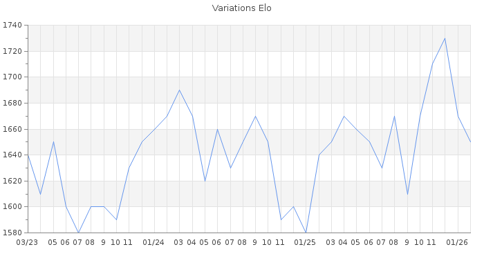 Date d'inscription : 16/10/22. Donateur pour EchecsEmail : Non ( Cliquez ici pour soutenir EchecsEmail. ) Elo non arrondi:1648.2 ( 308 sur 459 joueurs ) Nombre de victoires :625 Nombre de nulles :64 Nombre de défaites :803 Temps de réponse moyen par coup : 0J 4H 22M 26S ( Moyenne sur 3646 coups ). Rd ( Un petit rd indique un elo fiable ) : 54 Magic Elo:1711.93 Magic Rd : 80 Elo maximum atteint ( en étant classé ) :1780 Elo maximum atteint cette année :1730 Nombre coups joués : 65352 Inscrit dans l' équipe:Royal Kids Classement coupe : 57 Points coupe : 389.82 Classement Coupe Magic Chess : 5 Points Coupe Magic Chess : 94.18 Tournoi échelle : Division 2 : 1 Tournois gagnés : 31/01/2026 : Cat 3 : Victoire CC Jan26 Asc 20/12/2025 : Cat 2 : Premier au tournoi multi Automne 2025 n°1 17/12/2025 : Cat 2 : Victoire dans le tournoi n°27058 10/11/2025 : Cat 2 : Premier au tournoi multi Automne 2025 n°2 26/08/2025 : Cat 2 : Premier au tournoi multi Eté 2025 n°1 21/05/2025 : Cat 2 : Victoire CC Avr25 Asc 06/05/2025 : Cat 2 : Premier au tournoi multi Printemps 2025 n°1 25/04/2025 : Cat 2 : Premier au tournoi multi Printemps 2025 n°3 09/04/2025 : Cat 2 : Victoire dans le tournoi n°26494 01/03/2025 : Cat 2 : Victoire CC Fev25 Asc 02/02/2025 : Cat 2 : Victoire dans le tournoi n°26405 08/11/2024 : Cat 2 : Premier au tournoi multi Automne 2024 n°3 04/11/2024 : Cat 2 : Victoire CC Juil24 Asc 17/07/2024 : Cat 2 : Premier au tournoi multi Eté 2024 n°3 17/04/2024 : Cat 2 : Victoire CC Jan24 Asc 17/04/2024 : Cat 2 : Premier au tournoi multi Printemps 2024 n°2 03/03/2024 : Cat 2 : Victoire dans le tournoi n°25481 19/02/2024 : Cat 2 : Victoire CC Fev24 Asc 30/12/2023 : Cat 2 : Victoire dans le tournoi n°25202 06/11/2023 : Cat 2 : Victoire dans le tournoi n°25253 07/09/2023 : Cat 2 : Victoire dans le tournoi n°24982 16/08/2023 : Cat 2 : Victoire dans le tournoi n°24882 27/06/2023 : Cat 1 : Victoire CC Juin23 Asc 31/03/2023 : Cat 1 : Victoire CC Mar23 Asc 21/03/2023 : Cat 2 : Victoire dans le tournoi n°24649 19/03/2023 : Cat 2 : Victoire dans le tournoi n°24707 Nombre de tournois gagnés :34