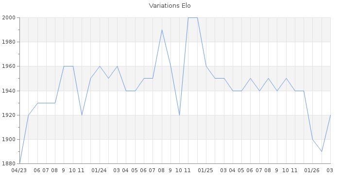 Date d'inscription : 19/11/19. Donateur pour EchecsEmail : Oui ( Cliquez ici pour soutenir EchecsEmail. ) Elo non arrondi:1921.1 ( 166 sur 441 joueurs ) Nombre de victoires :968 Nombre de nulles :206 Nombre de défaites :651 Temps de réponse moyen par coup : 0J 4H 21M 50S ( Moyenne sur 1850 coups ). Rd ( Un petit rd indique un elo fiable ) : 51 Magic Elo:1700 Magic Rd : 350 Elo maximum atteint ( en étant classé ) :2020 Elo maximum atteint cette année :1930 Nombre coups joués : 64466 Classement coupe : Inactif Points coupe : 0.55 Classement Coupe Magic Chess : Inactif Points Coupe Magic Chess : 0 Tournoi échelle : Inactif. Tournois gagnés : 13/03/2026 : Cat 3 : Victoire dans le tournoi n°27475 09/03/2026 : Cat 4 : Victoire dans le tournoi n°27436 03/02/2026 : Cat 4 : Victoire dans le tournoi n°27374 31/01/2026 : Cat 4 : Victoire dans le tournoi n°27386 28/01/2026 : Cat 4 : Victoire dans le tournoi n°27298 05/12/2025 : Cat 4 : Victoire dans le tournoi n°27037 10/11/2025 : Cat 4 : Victoire dans le tournoi n°27135 20/10/2025 : Cat 4 : Victoire dans le tournoi n°27041 22/08/2025 : Cat 4 : Victoire dans le tournoi n°26956 01/08/2025 : Cat 4 : Victoire dans le tournoi n°26760 24/07/2025 : Cat 4 : Victoire dans le tournoi n°26780 22/07/2025 : Cat 4 : Victoire dans le tournoi n°26707 21/07/2025 : Cat 4 : Victoire dans le tournoi n°26827 17/05/2025 : Cat 4 : Victoire dans le tournoi n°26655 15/05/2025 : Cat 4 : Victoire dans le tournoi n°26544 13/05/2025 : Cat 4 : Victoire dans le tournoi n°26665 09/05/2025 : Cat 4 : Victoire dans le tournoi n°26626 02/04/2025 : Cat 4 : Victoire dans le tournoi n°26609 27/02/2025 : Cat 4 : Victoire dans le tournoi n°26515 11/02/2025 : Cat 4 : Victoire dans le tournoi n°26452 29/01/2025 : Cat 4 : Victoire dans le tournoi n°26360 18/01/2025 : Cat 4 : Victoire dans le tournoi n°26235 15/12/2024 : Cat 4 : Victoire dans le tournoi n°26173 10/12/2024 : Cat 4 : Victoire dans le tournoi n°26307 22/11/2024 : Cat 4 : Victoire dans le tournoi n°26236 22/11/2024 : Cat 4 : Victoire dans le tournoi n°26011 16/09/2024 : Cat 4 : Victoire dans le tournoi n°26053 21/08/2024 : Cat 4 : Victoire dans le tournoi n°25955 13/08/2024 : Cat 4 : Victoire dans le tournoi n°25945 23/07/2024 : Cat 4 : Victoire dans le tournoi n°25874 16/05/2024 : Cat 4 : Victoire dans le tournoi n°25668 19/02/2024 : Cat 4 : Victoire dans le tournoi n°25205 08/02/2024 : Cat 4 : Victoire dans le tournoi n°25475 15/01/2024 : Cat 4 : Victoire dans le tournoi n°25466 22/12/2023 : Cat 4 : Victoire dans le tournoi n°25003 18/12/2023 : Cat 3 : Victoire dans le tournoi n°25432 14/12/2023 : Cat 4 : Victoire dans le tournoi n°25322 25/10/2023 : Cat 4 : Victoire dans le tournoi n°25200 07/09/2023 : Cat 4 : Victoire dans le tournoi n°24967 02/09/2023 : Cat 4 : Victoire dans le tournoi n°25121 25/06/2023 : Cat 3 : Victoire dans le tournoi n°24760 18/06/2023 : Cat 4 : Victoire dans le tournoi n°24905 16/05/2023 : Cat 4 : Victoire dans le tournoi n°24820 12/04/2023 : Cat 3 : Victoire dans le tournoi n°24724 05/04/2023 : Cat 3 : Victoire dans le tournoi n°24748 29/03/2023 : Cat 3 : Victoire dans le tournoi n°24632 23/03/2023 : Cat 3 : Victoire dans le tournoi n°24566 05/03/2023 : Cat 3 : Victoire dans le tournoi n°24662 28/01/2023 : Cat 3 : Victoire dans le tournoi n°24571 23/11/2022 : Cat 4 : Victoire dans le tournoi n°24275 21/11/2022 : Cat 4 : Victoire dans le tournoi n°24340 29/09/2022 : Cat 4 : Victoire dans le tournoi n°24158 28/09/2022 : Cat 4 : Victoire dans le tournoi n°24085 17/09/2022 : Cat 4 : Victoire dans le tournoi n°23827 02/09/2022 : Cat 4 : Victoire dans le tournoi n°24117 11/08/2022 : Cat 4 : Victoire dans le tournoi n°24155 07/08/2022 : Cat 4 : Victoire dans le tournoi n°23969 04/06/2022 : Cat 4 : Victoire dans le tournoi n°23867 23/04/2022 : Cat 4 : Victoire dans le tournoi n°23378 21/03/2022 : Cat 4 : Victoire dans le tournoi n°23675 20/03/2022 : Cat 4 : Victoire dans le tournoi n°23733 09/03/2022 : Cat 4 : Victoire dans le tournoi n°23602 06/03/2022 : Cat 4 : Victoire dans le tournoi n°23511 06/03/2022 : Cat 3 : Victoire dans le tournoi n°23632 24/02/2022 : Cat 3 : Victoire dans le tournoi n°23661 22/02/2022 : Cat 4 : Victoire dans le tournoi n°23348 07/01/2022 : Cat 4 : Victoire dans le tournoi n°23494 22/12/2021 : Cat 3 : Victoire dans le tournoi n°23340 13/12/2021 : Cat 3 : Victoire dans le tournoi n°23349 12/11/2021 : Cat 3 : Victoire dans le tournoi n°23061 02/11/2021 : Cat 3 : Victoire dans le tournoi n°22941 16/09/2021 : Cat 3 : Victoire dans le tournoi n°23080 15/09/2021 : Cat 3 : Victoire dans le tournoi n°23009 05/09/2021 : Cat 3 : Victoire dans le tournoi n°23087 24/08/2021 : Cat 3 : Victoire dans le tournoi n°23042 16/07/2021 : Cat 3 : Victoire dans le tournoi n°22902 14/06/2021 : Cat 4 : Victoire dans le tournoi n°22625 24/03/2021 : Cat 3 : Victoire dans le tournoi n°22468 16/03/2021 : Cat 3 : Victoire dans le tournoi n°22126 25/02/2021 : Cat 3 : Victoire dans le tournoi n°22424 15/12/2020 : Cat 3 : Victoire dans le tournoi n°22156 12/12/2020 : Cat 3 : Victoire dans le tournoi n°22154 05/12/2020 : Cat 3 : Victoire dans le tournoi n°22079 21/11/2020 : Cat 3 : Victoire dans le tournoi n°22063 19/11/2020 : Cat 3 : Victoire dans le tournoi n°22042 10/11/2020 : Cat 3 : Victoire dans le tournoi n°21915 16/10/2020 : Cat 3 : Victoire dans le tournoi n°21841 25/08/2020 : Cat 3 : Victoire dans le tournoi n°21564 23/08/2020 : Cat 3 : Victoire dans le tournoi n°21664 16/08/2020 : Cat 3 : Victoire dans le tournoi n°21268 02/08/2020 : Cat 3 : Victoire dans le tournoi n°21588 10/06/2020 : Cat 3 : Victoire dans le tournoi n°21345 07/06/2020 : Cat 3 : Victoire dans le tournoi n°21264 28/05/2020 : Cat 3 : Victoire dans le tournoi n°21205 11/05/2020 : Cat 3 : Victoire dans le tournoi n°21254 08/05/2020 : Cat 3 : Victoire dans le tournoi n°21239 08/05/2020 : Cat 3 : Victoire dans le tournoi n°21186 04/05/2020