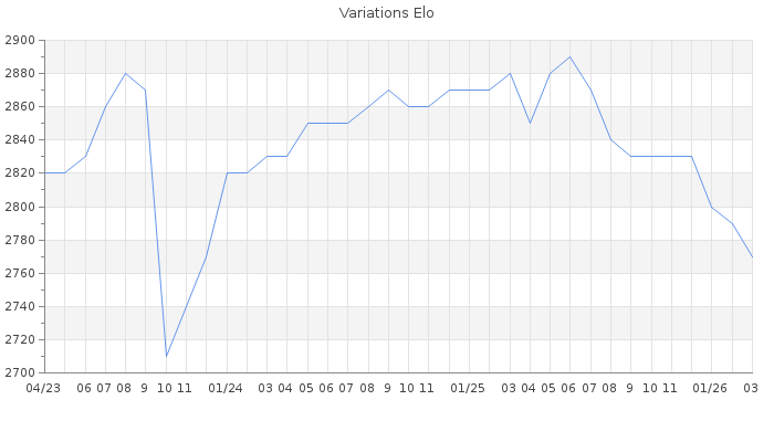 Date d'inscription : 15/06/22. Donateur pour EchecsEmail : Non ( Cliquez ici pour soutenir EchecsEmail. ) Elo non arrondi:2769.4 ( 9 sur 444 joueurs ) Nombre de victoires :113 Nombre de nulles :89 Nombre de défaites :11 Temps de réponse moyen par coup : 0J 11H 4M 21S ( Moyenne sur 321 coups ). Rd ( Un petit rd indique un elo fiable ) : 74 Magic Elo:1700 Magic Rd : 350 Elo maximum atteint ( en étant classé ) :2890 Elo maximum atteint cette année :2820 Nombre coups joués : 6799 Inscrit dans l' équipe:les modestes Classement coupe : Inactif, date de la dernière qualification : 04/02/24 Points coupe : 790.88 Classement Coupe Magic Chess : Inactif Points Coupe Magic Chess : 0 Tournoi échelle : Inactif. Tournois gagnés : 22/07/2023 : Cat 6 : Victoire CC Avr23 02/04/2023 : Cat 7 : Victoire dans le tournoi n°24601 31/01/2023 : Cat 7 : Victoire dans le tournoi n°24186 23/11/2022 : Cat 7 : Victoire dans le tournoi n°24095 05/10/2022 : Cat 6 : Victoire dans le tournoi n°24137 Nombre de tournois gagnés :5