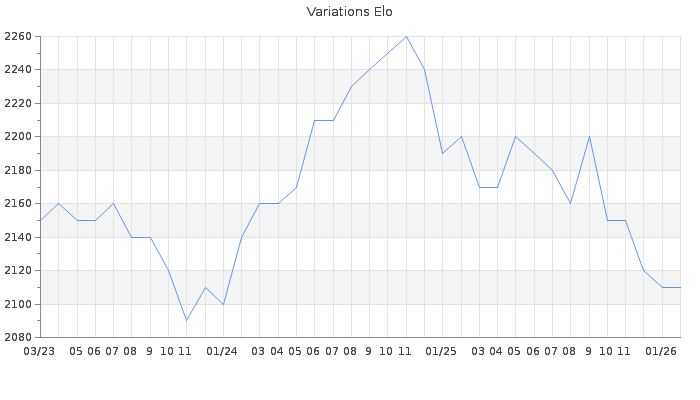 Date d'inscription : 11/01/16. Donateur pour EchecsEmail : Non ( Cliquez ici pour soutenir EchecsEmail. ) Elo non arrondi:2111.9 ( 85 sur 463 joueurs ) Nombre de victoires :784 Nombre de nulles :150 Nombre de défaites :644 Temps de réponse moyen par coup : 0J 4H 48M 11S ( Moyenne sur 970 coups ). Rd ( Un petit rd indique un elo fiable ) : 53 Magic Elo:1600 Magic Rd : 350 Elo maximum atteint ( en étant classé ) :2270 Elo maximum atteint cette année :2130 Nombre coups joués : 51678 Inscrit dans l' équipe:Mission Impossible Classement coupe : 24 Points coupe : 2531.97 Classement Coupe Magic Chess : Inactif Points Coupe Magic Chess : 0 Tournoi échelle : Inactif. Tournois gagnés : 17/10/2024 : Cat 5 : Victoire dans le tournoi n°25785 22/11/2022 : Cat 5 : Victoire dans le tournoi n°24210 30/07/2020 : Cat 5 : Victoire dans le tournoi n°21477 26/02/2020 : Cat 5 : Victoire dans le tournoi n°20731 23/02/2020 : Cat 5 : Victoire dans le tournoi n°20753 18/02/2020 : Cat 5 : Victoire dans le tournoi n°20667 30/10/2019 : Cat 5 : Victoire dans le tournoi n°20275 20/10/2019 : Cat 5 : Victoire dans le tournoi n°20097 17/06/2019 : Cat 5 : Victoire dans le tournoi n°19684 06/06/2019 : Cat 5 : Victoire dans le tournoi n°19631 03/12/2018 : Cat 5 : Victoire dans le tournoi n°18975 23/04/2018 : Cat 5 : Victoire dans le tournoi n°17886 26/01/2018 : Cat 5 : Victoire dans le tournoi n°17411 06/09/2017 : Cat 5 : Victoire dans le tournoi n°16788 02/09/2017 : Cat 5 : Victoire dans le tournoi n°16829 20/04/2017 : Cat 5 : Victoire dans le tournoi n°16114 05/11/2016 : Cat 5 : Victoire dans le tournoi n°15482 03/11/2016 : Cat 5 : Victoire dans le tournoi n°15319 06/08/2016 : Cat 5 : Victoire dans le tournoi n°15039 23/06/2016 : Cat 5 : Victoire dans le tournoi n°14727 03/03/2016 : Cat 4 : Victoire dans le tournoi n°14427 Nombre de tournois gagnés :21