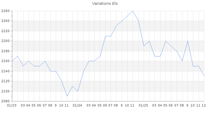 Date d'inscription : 11/01/16. Donateur pour EchecsEmail : Non ( Cliquez ici pour soutenir EchecsEmail. ) Elo non arrondi:2132.9 ( 71 sur 450 joueurs ) Nombre de victoires :771 Nombre de nulles :148 Nombre de défaites :631 Temps de réponse moyen par coup : 0J 5H 7M 28S ( Moyenne sur 1103 coups ). Rd ( Un petit rd indique un elo fiable ) : 61 Magic Elo:1600 Magic Rd : 350 Elo maximum atteint ( en étant classé ) :2270 Elo maximum atteint cette année :2250 Nombre coups joués : 50945 Inscrit dans l' équipe:Mission Impossible Classement coupe : 24 Points coupe : 2473.72 Classement Coupe Magic Chess : Inactif Points Coupe Magic Chess : 0 Tournoi échelle : Inactif. Tournois gagnés : 17/10/2024 : Cat 5 : Victoire dans le tournoi n°25785 22/11/2022 : Cat 5 : Victoire dans le tournoi n°24210 30/07/2020 : Cat 5 : Victoire dans le tournoi n°21477 26/02/2020 : Cat 5 : Victoire dans le tournoi n°20731 23/02/2020 : Cat 5 : Victoire dans le tournoi n°20753 18/02/2020 : Cat 5 : Victoire dans le tournoi n°20667 30/10/2019 : Cat 5 : Victoire dans le tournoi n°20275 20/10/2019 : Cat 5 : Victoire dans le tournoi n°20097 17/06/2019 : Cat 5 : Victoire dans le tournoi n°19684 06/06/2019 : Cat 5 : Victoire dans le tournoi n°19631 03/12/2018 : Cat 5 : Victoire dans le tournoi n°18975 23/04/2018 : Cat 5 : Victoire dans le tournoi n°17886 26/01/2018 : Cat 5 : Victoire dans le tournoi n°17411 06/09/2017 : Cat 5 : Victoire dans le tournoi n°16788 02/09/2017 : Cat 5 : Victoire dans le tournoi n°16829 20/04/2017 : Cat 5 : Victoire dans le tournoi n°16114 05/11/2016 : Cat 5 : Victoire dans le tournoi n°15482 03/11/2016 : Cat 5 : Victoire dans le tournoi n°15319 06/08/2016 : Cat 5 : Victoire dans le tournoi n°15039 23/06/2016 : Cat 5 : Victoire dans le tournoi n°14727 03/03/2016 : Cat 4 : Victoire dans le tournoi n°14427 Nombre de tournois gagnés :21