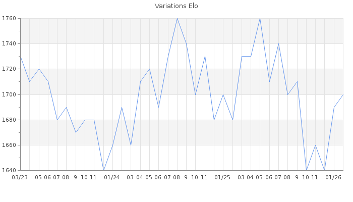 Date d'inscription : 14/02/14. Donateur pour EchecsEmail : Non ( Cliquez ici pour soutenir EchecsEmail. ) Elo non arrondi:1695.4 ( 276 sur 454 joueurs ) Nombre de victoires :615 Nombre de nulles :86 Nombre de défaites :486 Temps de réponse moyen par coup : 0J 9H 18M 18S ( Moyenne sur 978 coups ). Rd ( Un petit rd indique un elo fiable ) : 60 Magic Elo:1600 Magic Rd : 350 Elo maximum atteint ( en étant classé ) :1800 Elo maximum atteint cette année :1710 Nombre coups joués : 47472 Classement coupe : Inactif Points coupe : 0 Classement Coupe Magic Chess : Inactif Points Coupe Magic Chess : 0 Tournoi échelle : Inactif. Tournois gagnés : 07/01/2026 : Cat 2 : Victoire dans le tournoi n°27282 19/07/2025 : Cat 3 : Victoire dans le tournoi n°26872 20/05/2025 : Cat 3 : Victoire dans le tournoi n°26720 14/04/2025 : Cat 2 : Victoire dans le tournoi n°26594 24/03/2025 : Cat 2 : Victoire dans le tournoi n°26487 11/03/2025 : Cat 2 : Victoire dans le tournoi n°26539 14/02/2025 : Cat 2 : Victoire dans le tournoi n°26446 06/08/2024 : Cat 2 : Victoire dans le tournoi n°25915 02/07/2024 : Cat 2 : Victoire dans le tournoi n°25882 05/06/2024 : Cat 2 : Victoire dans le tournoi n°25766 23/04/2024 : Cat 2 : Victoire dans le tournoi n°25689 27/01/2024 : Cat 2 : Victoire dans le tournoi n°25443 28/10/2023 : Cat 2 : Victoire dans le tournoi n°25276 27/10/2023 : Cat 2 : Victoire dans le tournoi n°25197 05/10/2023 : Cat 2 : Victoire dans le tournoi n°25157 22/07/2023 : Cat 2 : Victoire dans le tournoi n°24942 17/01/2023 : Cat 3 : Victoire dans le tournoi n°24522 10/05/2022 : Cat 2 : Victoire dans le tournoi n°23788 25/04/2022 : Cat 2 : Victoire dans le tournoi n°23808 02/04/2022 : Cat 2 : Victoire dans le tournoi n°23707 29/03/2022 : Cat 2 : Victoire dans le tournoi n°23641 31/12/2021 : Cat 2 : Victoire dans le tournoi n°23361 03/12/2021 : Cat 2 : Victoire dans le tournoi n°23285 19/11/2021 : Cat 2 : Victoire dans le tournoi n°23177 27/04/2021 : Cat 2 : Victoire dans le tournoi n°22551 31/12/2020 : Cat 2 : Victoire dans le tournoi n°21992 14/12/2020 : Cat 3 : Victoire dans le tournoi n°21926 10/06/2020 : Cat 2 : Victoire dans le tournoi n°21181 19/05/2020 : Cat 2 : Victoire dans le tournoi n°21079 28/02/2020 : Cat 2 : Victoire dans le tournoi n°20651 09/02/2020 : Cat 2 : Victoire dans le tournoi n°20499 27/01/2020 : Cat 2 : Victoire dans le tournoi n°20541 23/12/2019 : Cat 2 : Victoire dans le tournoi n°20462 15/12/2019 : Cat 2 : Victoire dans le tournoi n°20319 19/10/2019 : Cat 2 : Victoire dans le tournoi n°20164 03/10/2019 : Cat 2 : Victoire dans le tournoi n°19588 04/03/2019 : Cat 2 : Victoire dans le tournoi n°19295 17/12/2018 : Cat 3 : Victoire dans le tournoi n°18759 12/10/2018 : Cat 2 : Victoire dans le tournoi n°18528 12/06/2018 : Cat 2 : Victoire dans le tournoi n°17958 21/04/2018 : Cat 2 : Victoire dans le tournoi n°17908 25/11/2017 : Cat 2 : Victoire dans le tournoi n°17214 11/08/2017 : Cat 2 : Victoire dans le tournoi n°16710 31/05/2017 : Cat 2 : Victoire dans le tournoi n°16401 10/01/2017 : Cat 2 : Victoire dans le tournoi n°15574 22/12/2016 : Cat 2 : Victoire dans le tournoi n°15689 06/11/2016 : Cat 2 : Victoire dans le tournoi n°15361 18/08/2016 : Cat 2 : Victoire dans le tournoi n°15119 17/03/2016 : Cat 2 : Victoire dans le tournoi n°14165 20/12/2015 : Cat 2 : Victoire dans le tournoi n°18827 03/10/2015 : Cat 2 : Victoire dans le tournoi n°18313 31/05/2015 : Cat 2 : Victoire dans le tournoi n°17517 03/02/2015 : Cat 2 : Victoire dans le tournoi n°16636 30/01/2015 : Cat 2 : Victoire dans le tournoi n°16923 09/12/2014 : Cat 2 : Victoire dans le tournoi n°16565 06/10/2014 : Cat 3 : Victoire dans le tournoi n°15839 29/08/2014 : Cat 3 : Victoire dans le tournoi n°15538 11/04/2014 : Cat 2 : Victoire dans le tournoi n°14867 26/03/2014 : Cat 2 : Victoire dans le tournoi n°14738 Nombre de tournois gagnés :59
