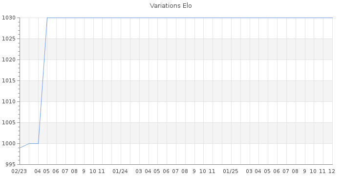 Date d'inscription : 13/02/23. Donateur pour EchecsEmail : Non ( Cliquez ici pour soutenir EchecsEmail. ) Elo non arrondi:997.5 ( 546 sur 449 joueurs ) Nombre de victoires :2 Nombre de nulles :0 Nombre de défaites :26 Temps de réponse moyen par coup : 0J 22H 25M 42S ( Moyenne sur 0 coups ). Rd ( Un petit rd indique un elo fiable ) : 108 Magic Elo:1700 Magic Rd : 350 Elo maximum atteint ( en étant classé ) :1110 Elo maximum atteint cette année :0 Nombre coups joués : 457 Classement coupe : Inactif Points coupe : 0 Classement Coupe Magic Chess : Inactif Points Coupe Magic Chess : 0 Tournoi échelle : Inactif. Nombre de tournois gagnés :0