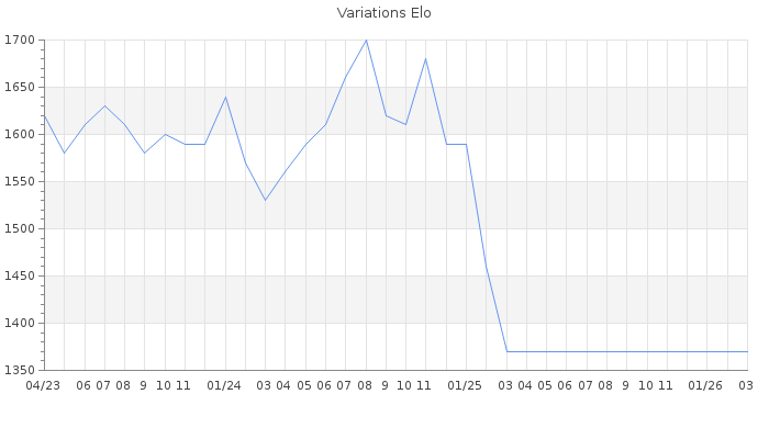 Date d'inscription : 03/06/20. Donateur pour EchecsEmail : Non ( Cliquez ici pour soutenir EchecsEmail. ) Elo non arrondi:1337.2 ( 443 sur 445 joueurs ) Nombre de victoires :3465 Nombre de nulles :1282 Nombre de défaites :5068 Temps de réponse moyen par coup : 0J 1H 18M 23S ( Moyenne sur 33 coups ). Rd ( Un petit rd indique un elo fiable ) : 50 Magic Elo:1462.32 Magic Rd : 222 Elo maximum atteint ( en étant classé ) :1730 Elo maximum atteint cette année :0 Nombre coups joués : 397823 Classement coupe : Inactif, date de la dernière qualification : 14/02/25 Points coupe : 715.91 Classement Coupe Magic Chess : Inactif Points Coupe Magic Chess : 0 Tournoi échelle : Inactif. Tournois gagnés : 24/12/2024 : Cat 2 : Victoire CC Dec24 Asc 14/01/2024 : Cat 2 : Premier au tournoi multi Noël 2023 n°3 30/09/2023 : Cat 2 : Victoire dans le tournoi n°25035 23/09/2023 : Cat 2 : Victoire CC Sep23 Asc 24/08/2023 : Cat 2 : Victoire CC Aut23 Asc 12/08/2023 : Cat 2 : Victoire dans le tournoi n°25048 02/08/2023 : Cat 2 : Victoire dans le tournoi n°25080 22/07/2023 : Cat 2 : Premier au tournoi multi Eté 2023 n°4 21/05/2023 : Cat 2 : Victoire CC Mai23 Asc 21/05/2023 : Cat 3 : Victoire dans le tournoi n°24823 08/05/2023 : Cat 2 : Victoire dans le tournoi n°24860 13/04/2023 : Cat 2 : Victoire dans le tournoi n°24749 12/04/2023 : Cat 2 : Victoire dans le tournoi n°24766 07/04/2023 : Cat 2 : Victoire dans le tournoi n°24754 28/03/2023 : Cat 2 : Victoire dans le tournoi n°24765 23/01/2023 : Cat 2 : Victoire dans le tournoi n°24488 13/01/2023 : Cat 2 : Victoire dans le tournoi n°24553 02/01/2023 : Cat 2 : Victoire CC Nov22 Asc 31/12/2022 : Cat 2 : Victoire dans le tournoi n°24508 30/12/2022 : Cat 2 : Victoire dans le tournoi n°24521 28/12/2022 : Cat 2 : Victoire dans le tournoi n°24438 14/12/2022 : Cat 2 : Victoire dans le tournoi n°24489 13/12/2022 : Cat 2 : Premier au tournoi multi Halloween 2022 n°3 18/11/2022 : Cat 2 : Victoire dans le tournoi n°24349 05/11/2022 : Cat 2 : Victoire dans le tournoi n°24333 04/11/2022 : Cat 2 : Victoire dans le tournoi n°24343 04/09/2022 : Cat 2 : Victoire dans le tournoi n°23765 28/08/2022 : Cat 2 : Victoire dans le tournoi n°24142 12/07/2022 : Cat 2 : Victoire dans le tournoi n°23916 27/06/2022 : Cat 2 : Victoire dans le tournoi n°23786 28/01/2022 : Cat 2 : Victoire dans le tournoi n°23578 24/01/2022 : Cat 3 : Victoire CC Dec21 Asc 04/01/2022 : Cat 2 : Victoire dans le tournoi n°23457 09/12/2021 : Cat 2 : Victoire dans le tournoi n°23397 15/09/2021 : Cat 2 : Victoire dans le tournoi n°23152 15/08/2021 : Cat 2 : Victoire dans le tournoi n°22856 24/07/2021 : Cat 2 : Victoire dans le tournoi n°22784 30/06/2021 : Cat 2 : Premier au tournoi multi Eté 2021 n°3 25/05/2021 : Cat 2 : Victoire dans le tournoi n°22407 28/02/2021 : Cat 2 : Victoire dans le tournoi n°22480 28/12/2020 : Cat 2 : Premier au tournoi multi Halloween 2020 n°3 27/10/2020 : Cat 3 : Victoire dans le tournoi n°21468 17/10/2020 : Cat 3 : Victoire dans le tournoi n°21457 11/10/2020 : Cat 2 : Victoire dans le tournoi n°21514 11/08/2020 : Cat 1 : Premier au tournoi multi Eté 2020 n°3 Nombre de tournois gagnés :51