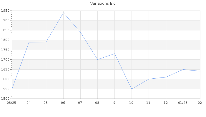 Date d'inscription : 20/03/25. Donateur pour EchecsEmail : Non ( Cliquez ici pour soutenir EchecsEmail. ) Elo non arrondi:1642 ( 318 sur 461 joueurs ) Nombre de victoires :49 Nombre de nulles :3 Nombre de défaites :42 Temps de réponse moyen par coup : 1J 2H 34M 43S ( Moyenne sur 484 coups ). Rd ( Un petit rd indique un elo fiable ) : 70 Magic Elo:1700 Magic Rd : 350 Elo maximum atteint ( en étant classé ) :1940 Elo maximum atteint cette année :1650 Nombre coups joués : 2708 Inscrit dans l' équipe:Les Gens du Sud Classement coupe : Inactif Points coupe : 0 Classement Coupe Magic Chess : Inactif Points Coupe Magic Chess : 0 Tournoi échelle : Tournois gagnés : 04/07/2025 : Cat 1 : Victoire dans le tournoi n°26593 08/06/2025 : Cat 1 : Victoire dans le tournoi n°26624 Nombre de tournois gagnés :2