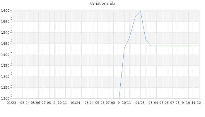 Date d'inscription : 13/08/15. Donateur pour EchecsEmail : Non ( Cliquez ici pour soutenir EchecsEmail. ) Elo non arrondi:1412.1 ( 430 sur 449 joueurs ) Nombre de victoires :173 Nombre de nulles :6 Nombre de défaites :184 Temps de réponse moyen par coup : 0J 11H 1M 48S ( Moyenne sur 14 coups ). Rd ( Un petit rd indique un elo fiable ) : 57 Magic Elo:1600 Magic Rd : 350 Elo maximum atteint ( en étant classé ) :1620 Elo maximum atteint cette année :1620 Nombre coups joués : 10713 Classement coupe : Inactif Points coupe : 4.22 Classement Coupe Magic Chess : Inactif Points Coupe Magic Chess : 0 Tournoi échelle : Inactif. Tournois gagnés : 10/01/2025 : Cat 2 : Victoire dans le tournoi n°26359 10/01/2025 : Cat 1 : Victoire dans le tournoi n°26327 04/01/2025 : Cat 1 : Victoire dans le tournoi n°26257 11/10/2016 : Cat 0 : Victoire dans le tournoi n°15263 20/06/2016 : Cat 0 : Victoire dans le tournoi n°14759 21/12/2015 : Cat 0 : Victoire dans le tournoi n°18667 Nombre de tournois gagnés :6