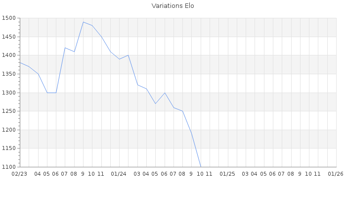 Date d'inscription : 21/07/07. Donateur pour EchecsEmail : Non ( Cliquez ici pour soutenir EchecsEmail. ) Elo non arrondi:1072.1 ( 482 sur 459 joueurs ) Nombre de victoires :2285 Nombre de nulles :149 Nombre de défaites :1900 Temps de réponse moyen par coup : 0J 22H 10M 17S ( Moyenne sur 0 coups ). Rd ( Un petit rd indique un elo fiable ) : 62 Magic Elo:1600 Magic Rd : 350 Elo maximum atteint ( en étant classé ) :1850 Elo maximum atteint cette année :0 Nombre coups joués : 128365 Classement coupe : Inactif Points coupe : 0 Classement Coupe Magic Chess : Inactif Points Coupe Magic Chess : 0 Tournoi échelle : Inactif. Tournois gagnés : 08/05/2024 : Cat 1 : Victoire dans le tournoi n°25699 13/10/2023 : Cat 1 : Victoire dans le tournoi n°25199 01/08/2022 : Cat 1 : Victoire dans le tournoi n°24048 18/07/2022 : Cat 1 : Victoire dans le tournoi n°24016 08/07/2022 : Cat 2 : Victoire dans le tournoi n°23992 24/05/2022 : Cat 2 : Victoire dans le tournoi n°23850 17/05/2022 : Cat 2 : Victoire dans le tournoi n°23865 05/04/2022 : Cat 2 : Victoire dans le tournoi n°23736 31/03/2022 : Cat 2 : Victoire dans le tournoi n°23752 15/03/2022 : Cat 2 : Victoire dans le tournoi n°23731 14/03/2022 : Cat 2 : Victoire dans le tournoi n°23689 02/03/2022 : Cat 2 : Victoire dans le tournoi n°23672 27/12/2021 : Cat 2 : Victoire dans le tournoi n°23459 01/12/2021 : Cat 2 : Victoire dans le tournoi n°23385 24/11/2021 : Cat 2 : Victoire dans le tournoi n°23323 14/10/2021 : Cat 2 : Victoire dans le tournoi n°23234 13/10/2021 : Cat 2 : Victoire dans le tournoi n°23122 30/09/2021 : Cat 2 : Victoire dans le tournoi n°23161 13/09/2021 : Cat 2 : Victoire dans le tournoi n°23131 29/07/2021 : Cat 2 : Victoire dans le tournoi n°22944 26/04/2021 : Cat 1 : Victoire dans le tournoi n°22608 15/12/2020 : Cat 2 : Victoire dans le tournoi n°22124 10/11/2020 : Cat 2 : Victoire dans le tournoi n°21934 03/11/2020 : Cat 2 : Victoire dans le tournoi n°21911 01/11/2020 : Cat 2 : Victoire dans le tournoi n°21921 24/09/2020 : Cat 2 : Victoire dans le tournoi n°21749 22/09/2020 : Cat 2 : Victoire dans le tournoi n°21708 27/08/2020 : Cat 2 : Victoire dans le tournoi n°21623 22/08/2020 : Cat 2 : Victoire dans le tournoi n°21650 29/07/2020 : Cat 2 : Victoire dans le tournoi n°21562 28/07/2020 : Cat 2 : Victoire dans le tournoi n°21522 09/07/2020 : Cat 2 : Victoire dans le tournoi n°21451 08/07/2020 : Cat 2 : Victoire dans le tournoi n°21434 15/06/2020 : Cat 2 : Victoire dans le tournoi n°21386 13/06/2020 : Cat 2 : Victoire dans le tournoi n°21306 26/05/2020 : Cat 2 : Victoire dans le tournoi n°21284 10/05/2020 : Cat 1 : Victoire dans le tournoi n°21091 26/04/2020 : Cat 1 : Victoire dans le tournoi n°21029 17/03/2019 : Cat 2 : Victoire dans le tournoi n°19329 08/09/2018 : Cat 2 : Victoire dans le tournoi n°18559 24/08/2018 : Cat 2 : Victoire dans le tournoi n°18238 13/08/2018 : Cat 2 : Victoire dans le tournoi n°18439 05/08/2018 : Cat 2 : Victoire dans le tournoi n°18457 02/08/2018 : Cat 2 : Victoire dans le tournoi n°18324 29/07/2018 : Cat 2 : Victoire dans le tournoi n°18206 25/07/2018 : Cat 2 : Victoire dans le tournoi n°18387 19/07/2018 : Cat 2 : Victoire dans le tournoi n°18286 19/07/2018 : Cat 2 : Victoire dans le tournoi n°18251 05/07/2018 : Cat 2 : Victoire dans le tournoi n°18175 24/06/2018 : Cat 2 : Victoire dans le tournoi n°18295 23/06/2018 : Cat 2 : Victoire dans le tournoi n°18097 11/06/2018 : Cat 2 : Victoire dans le tournoi n°18182 13/05/2018 : Cat 2 : Victoire dans le tournoi n°18043 25/03/2018 : Cat 3 : Victoire dans le tournoi n°17873 27/02/2018 : Cat 2 : Victoire dans le tournoi n°17584 24/01/2018 : Cat 2 : Victoire dans le tournoi n°17500 15/01/2018 : Cat 2 : Victoire dans le tournoi n°17507 08/01/2018 : Cat 2 : Victoire dans le tournoi n°17400 03/01/2018 : Cat 2 : Victoire dans le tournoi n°17393 01/01/2018 : Cat 2 : Victoire dans le tournoi n°17390 31/12/2017 : Cat 2 : Victoire dans le tournoi n°17461 11/12/2017 : Cat 2 : Victoire dans le tournoi n°17324 22/11/2017 : Cat 2 : Victoire dans le tournoi n°17310 05/11/2017 : Cat 2 : Victoire dans le tournoi n°17172 04/04/2017 : Cat 2 : Victoire dans le tournoi n°15914 15/02/2017 : Cat 2 : Victoire dans le tournoi n°15982 05/02/2017 : Cat 2 : Victoire dans le tournoi n°15976 31/01/2017 : Cat 2 : Victoire dans le tournoi n°15972 29/01/2017 : Cat 2 : Victoire dans le tournoi n°15916 19/12/2016 : Cat 2 : Victoire dans le tournoi n°15808 30/11/2016 : Cat 2 : Victoire dans le tournoi n°15367 29/11/2016 : Cat 2 : Victoire dans le tournoi n°15374 26/11/2016 : Cat 2 : Victoire dans le tournoi n°15602 08/07/2016 : Cat 2 : Victoire dans le tournoi n°15053 02/07/2016 : Cat 2 : Victoire dans le tournoi n°14852 20/05/2016 : Cat 2 : Victoire dans le tournoi n°14678 25/04/2016 : Cat 1 : Victoire dans le tournoi n°14648 10/04/2016 : Cat 1 : Victoire dans le tournoi n°14574 08/04/2016 : Cat 1 : Victoire dans le tournoi n°14534 03/04/2016 : Cat 1 : Victoire dans le tournoi n°14473 01/04/2016 : Cat 1 : Victoire dans le tournoi n°14512 29/03/2016 : Cat 0 : Victoire dans le tournoi n°14353 14/03/2016 : Cat 0 : Victoire dans le tournoi n°14314 08/03/2016 : Cat 0 : Victoire dans le tournoi n°14327 24/10/2014 : Cat 2 : Victoire dans le tournoi n°15653 29/09/2014 : Cat 2 : Victoire dans le tournoi n°15883 17/09/2014 : Cat 2 : Victoire dans le tournoi n°15838 17/07/2014 : Cat 2 : Victoire dans le tournoi n°15508 09/07/2014 : Cat 2 : Victoire dans le tournoi n°15449 22/04/2014 : Cat 2 : Victoire dans le tournoi n°14907 16/04/2014 : Cat 1 : Victoire dans le tournoi n°14661 05/04/2014 : Cat 1 : Victoire dans le tournoi n°14789 13/12/2013 : Cat 2 : Victoire dans le tournoi n°13535 03/10/2013 : Cat 1 : Victoire dans le tournoi n°13087 16/09/2013 : Cat 1 : Victoire dans le tournoi n°13032 04/09/2013 : Cat 1 : Victoire dans le tournoi n°13004 11/07/2013 : Cat 1 : Victoire dans le tournoi n°12653 25/12/2012 : Ca