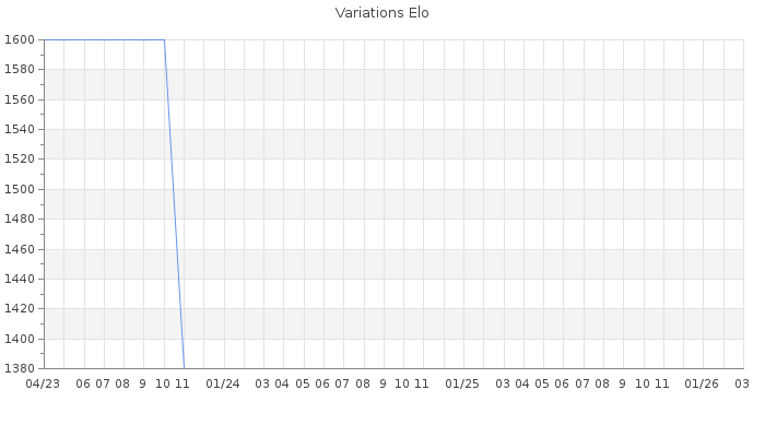 Date d'inscription : 27/10/18. Donateur pour EchecsEmail : Non ( Cliquez ici pour soutenir EchecsEmail. ) Elo non arrondi:1340.5 ( 477 sur 450 joueurs ) Nombre de victoires :14 Nombre de nulles :3 Nombre de défaites :14 Temps de réponse moyen par coup : 3J 7H 34M 34S ( Moyenne sur 0 coups ). Rd ( Un petit rd indique un elo fiable ) : 142 Magic Elo:1700 Magic Rd : 350 Elo maximum atteint ( en étant classé ) :1620 Elo maximum atteint cette année :0 Nombre coups joués : 896 Classement coupe : Inactif Points coupe : 0 Classement Coupe Magic Chess : Inactif Points Coupe Magic Chess : 0 Tournoi échelle : Tournois gagnés : 28/03/2021 : Cat 2 : Victoire dans le tournoi n°22342 22/01/2019 : Cat 0 : Victoire dans le tournoi n°18875 Nombre de tournois gagnés :2
