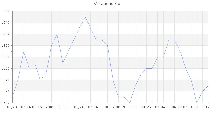 Date d'inscription : 07/02/12. Donateur pour EchecsEmail : Non ( Cliquez ici pour soutenir EchecsEmail. ) Elo non arrondi:1825.9 ( 206 sur 448 joueurs ) Nombre de victoires :1123 Nombre de nulles :195 Nombre de défaites :1302 Temps de réponse moyen par coup : 0J 7H 35M 18S ( Moyenne sur 1030 coups ). Rd ( Un petit rd indique un elo fiable ) : 65 Magic Elo:1492.91 Magic Rd : 172 Elo maximum atteint ( en étant classé ) :1990 Elo maximum atteint cette année :1940 Nombre coups joués : 90351 Inscrit dans l' équipe:LES CHATTERBOX Classement coupe : 65 Points coupe : 339.79 Classement Coupe Magic Chess : Inactif Points Coupe Magic Chess : 0 Tournoi échelle : Inactif. Tournois gagnés : 15/08/2025 : Cat 3 : Victoire dans le tournoi n°26957 19/06/2025 : Cat 3 : Victoire dans le tournoi n°26834 28/05/2025 : Cat 3 : Victoire dans le tournoi n°26770 27/04/2025 : Cat 3 : Victoire dans le tournoi n°26642 06/04/2025 : Cat 3 : Victoire dans le tournoi n°26625 02/04/2025 : Cat 3 : Victoire CC Mar25 Asc 17/03/2025 : Cat 3 : Victoire dans le tournoi n°26600 24/02/2025 : Cat 3 : Victoire dans le tournoi n°26505 27/11/2024 : Cat 3 : Victoire dans le tournoi n°26260 10/12/2023 : Cat 3 : Victoire dans le tournoi n°25340 12/11/2023 : Cat 3 : Victoire dans le tournoi n°25298 18/09/2023 : Cat 3 : Victoire dans le tournoi n°25195 12/08/2023 : Cat 3 : Victoire dans le tournoi n°25110 26/03/2023 : Cat 3 : Victoire dans le tournoi n°24762 06/02/2023 : Cat 3 : Victoire dans le tournoi n°24613 02/12/2021 : Cat 3 : Victoire dans le tournoi n°23402 02/12/2021 : Cat 3 : Victoire CC Nov21 18/02/2021 : Cat 3 : Victoire dans le tournoi n°22372 25/01/2021 : Cat 3 : Victoire dans le tournoi n°22194 25/01/2021 : Cat 3 : Victoire dans le tournoi n°22336 25/03/2020 : Cat 3 : Victoire dans le tournoi n°20995 19/08/2019 : Cat 2 : Victoire dans le tournoi n°19985 06/03/2019 : Cat 3 : Victoire dans le tournoi n°19414 06/11/2018 : Cat 3 : Victoire dans le tournoi n°18802 05/08/2018 : Cat 3 : Victoire dans le tournoi n°18478 01/08/2018 : Cat 2 : Victoire dans le tournoi n°18466 30/07/2017 : Cat 3 : Victoire dans le tournoi n°16553 02/03/2017 : Cat 3 : Victoire dans le tournoi n°15878 09/10/2016 : Cat 3 : Victoire dans le tournoi n°15527 13/08/2015 : Cat 3 : Victoire dans le tournoi n°18092 20/06/2015 : Cat 3 : Victoire dans le tournoi n°17894 09/06/2015 : Cat 2 : Victoire dans le tournoi n°17829 19/01/2015 : Cat 3 : Victoire dans le tournoi n°16822 20/12/2014 : Cat 3 : Victoire dans le tournoi n°16346 11/08/2014 : Cat 3 : Victoire dans le tournoi n°15697 20/04/2013 : Cat 3 : Victoire dans le tournoi n°12111 Nombre de tournois gagnés :36