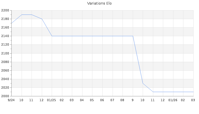 Date d'inscription : 04/09/24. Donateur pour EchecsEmail : Non ( Cliquez ici pour soutenir EchecsEmail. ) Elo non arrondi:2004.6 ( 124 sur 438 joueurs ) Nombre de victoires :32 Nombre de nulles :9 Nombre de défaites :15 Temps de réponse moyen par coup : 0J 3H 2M 52S ( Moyenne sur 28 coups ). Rd ( Un petit rd indique un elo fiable ) : 81 Elo maximum atteint ( en étant classé ) :2240 Elo maximum atteint cette année :0 Nombre coups joués : 1710 Classement coupe : Inactif, date de la dernière qualification : 18/09/24 Points coupe : 35.29 Classement Coupe Magic Chess : Inactif Points Coupe Magic Chess : 0 Tournoi échelle : Inactif. Tournois gagnés : 10/11/2024 : Cat 4 : Victoire dans le tournoi n°26078 Nombre de tournois gagnés :1