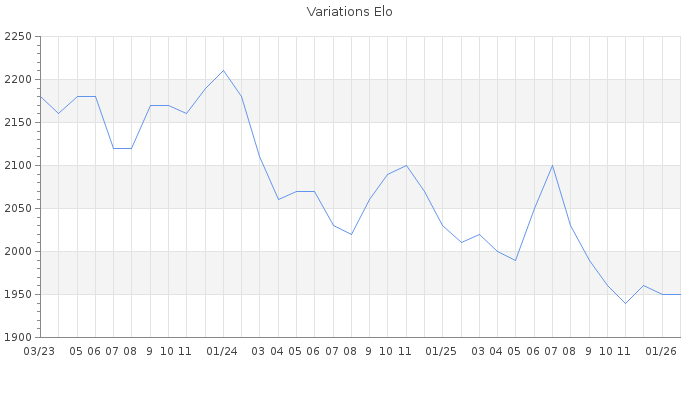 Date d'inscription : 20/11/13. Donateur pour EchecsEmail : Non ( Cliquez ici pour soutenir EchecsEmail. ) Elo non arrondi:1954.8 ( 157 sur 463 joueurs ) Nombre de victoires :444 Nombre de nulles :123 Nombre de défaites :236 Temps de réponse moyen par coup : 0J 22H 41M 34S ( Moyenne sur 448 coups ). Rd ( Un petit rd indique un elo fiable ) : 66 Magic Elo:1600 Magic Rd : 350 Elo maximum atteint ( en étant classé ) :2450 Elo maximum atteint cette année :1970 Nombre coups joués : 27358 Inscrit dans l' équipe:Les Rois du Succes Classement coupe : 70 Points coupe : 259.6 Classement Coupe Magic Chess : Inactif Points Coupe Magic Chess : 0 Tournoi échelle : Inactif. Tournois gagnés : 17/03/2023 : Cat 5 : Victoire dans le tournoi n°24468 29/10/2021 : Cat 5 : Victoire dans le tournoi n°22714 03/07/2021 : Cat 5 : Victoire dans le tournoi n°22791 18/06/2021 : Cat 5 : Victoire dans le tournoi n°22333 24/12/2020 : Cat 5 : Victoire dans le tournoi n°21815 05/06/2018 : Cat 6 : Victoire dans le tournoi n°17854 01/05/2018 : Cat 5 : Victoire dans le tournoi n°17191 15/01/2018 : Cat 6 : Victoire dans le tournoi n°17209 29/03/2016 : Cat 6 : Victoire dans le tournoi n°14189 27/03/2016 : Cat 6 : Victoire dans le tournoi n°18946 18/04/2015 : Cat 5 : Victoire dans le tournoi n°16864 28/01/2015 : Cat 5 : Victoire dans le tournoi n°16691 30/11/2014 : Cat 5 : Victoire dans le tournoi n°15896 12/08/2014 : Cat 5 : Victoire dans le tournoi n°15545 Nombre de tournois gagnés :14