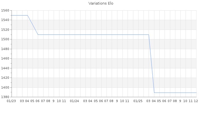 Date d'inscription : 30/07/15. Donateur pour EchecsEmail : Non ( Cliquez ici pour soutenir EchecsEmail. ) Elo non arrondi:1364.6 ( 437 sur 448 joueurs ) Nombre de victoires :90 Nombre de nulles :4 Nombre de défaites :115 Temps de réponse moyen par coup : 1J 4H 1M 12S ( Moyenne sur 1 coups ). Rd ( Un petit rd indique un elo fiable ) : 157 Magic Elo:1600 Magic Rd : 350 Elo maximum atteint ( en étant classé ) :1910 Elo maximum atteint cette année :0 Nombre coups joués : 6427 Inscrit dans l' équipe:No Game No Life Classement coupe : Inactif Points coupe : 0 Classement Coupe Magic Chess : Inactif Points Coupe Magic Chess : 0 Tournoi échelle : Inactif. Tournois gagnés : 04/06/2018 : Cat 4 : Victoire dans le tournoi n°18130 Nombre de tournois gagnés :1
