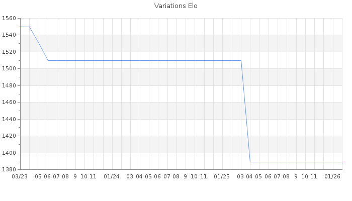 Date d'inscription : 30/07/15. Donateur pour EchecsEmail : Non ( Cliquez ici pour soutenir EchecsEmail. ) Elo non arrondi:1360.6 ( 437 sur 458 joueurs ) Nombre de victoires :90 Nombre de nulles :4 Nombre de défaites :115 Temps de réponse moyen par coup : 1J 4H 1M 12S ( Moyenne sur 0 coups ). Rd ( Un petit rd indique un elo fiable ) : 157 Magic Elo:1600 Magic Rd : 350 Elo maximum atteint ( en étant classé ) :1910 Elo maximum atteint cette année :0 Nombre coups joués : 6427 Inscrit dans l' équipe:No Game No Life Classement coupe : Inactif Points coupe : 0 Classement Coupe Magic Chess : Inactif Points Coupe Magic Chess : 0 Tournoi échelle : Inactif. Tournois gagnés : 04/06/2018 : Cat 4 : Victoire dans le tournoi n°18130 Nombre de tournois gagnés :1