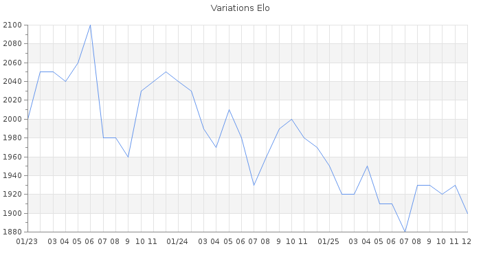 Date d'inscription : 29/11/20. Donateur pour EchecsEmail : Non ( Cliquez ici pour soutenir EchecsEmail. ) Elo non arrondi:1903.2 ( 172 sur 449 joueurs ) Nombre de victoires :365 Nombre de nulles :53 Nombre de défaites :184 Temps de réponse moyen par coup : 1J 0H 46M 27S ( Moyenne sur 142 coups ). Rd ( Un petit rd indique un elo fiable ) : 81 Magic Elo:1700 Magic Rd : 350 Elo maximum atteint ( en étant classé ) :2110 Elo maximum atteint cette année :1960 Nombre coups joués : 20432 Classement coupe : Inactif Points coupe : 0 Classement Coupe Magic Chess : Inactif Points Coupe Magic Chess : 0 Tournoi échelle : Inactif. Tournois gagnés : 12/05/2024 : Cat 4 : Victoire dans le tournoi n°25459 03/12/2023 : Cat 4 : Victoire dans le tournoi n°25290 04/04/2021 : Cat 4 : Victoire dans le tournoi n°22532 20/12/2020 : Cat 2 : Victoire dans le tournoi n°22132 12/12/2020 : Cat 2 : Victoire dans le tournoi n°22148 12/12/2020 : Cat 3 : Victoire dans le tournoi n°22149 Nombre de tournois gagnés :6